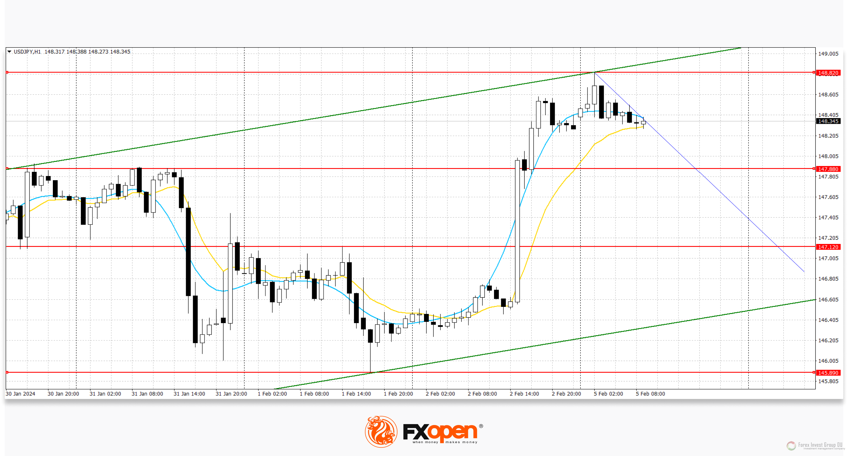 Пара USD/JPY развивает сильный «бычий» импульс в районе 148.32, сформировавшийся в пятницу, после публикации американской макроэкономической статистики по рынку труда. Трейдеры отреагировали на данные коррекцией ожиданий относительно скорого снижения процентных ставок ФРС США, не исключая его в марте, однако больше рассчитывая на майское или даже июньское заседания регулятора. Сильное сопротивление на графике USD/JPY можно увидеть на отметке 148,82, прорыв вверх может спровоцировать рост к 149,68. С другой стороны, ближайшая поддержка видна на отметке 147,88. Прорыв ниже может привести пару к отметке 147,12.
