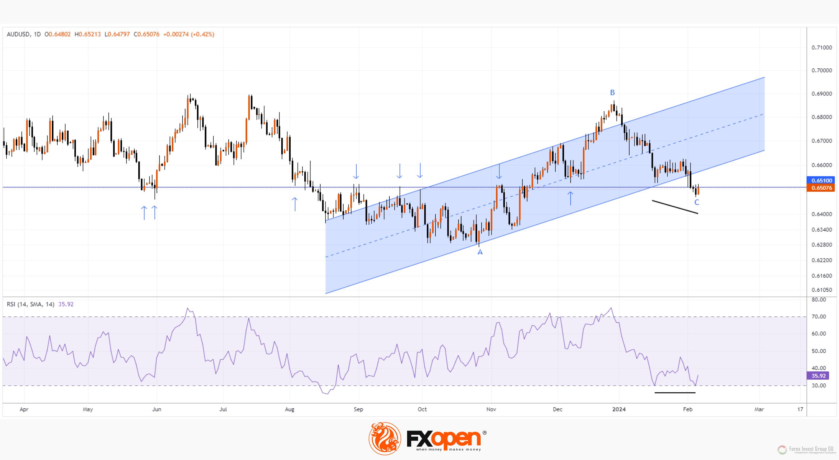 При этом цена находится около важного уровня 0.6510, который с середины 2023 года неоднократно показывал свое влияние на цену AUD/USD и как поддержка, и как сопротивление (показано стрелками).