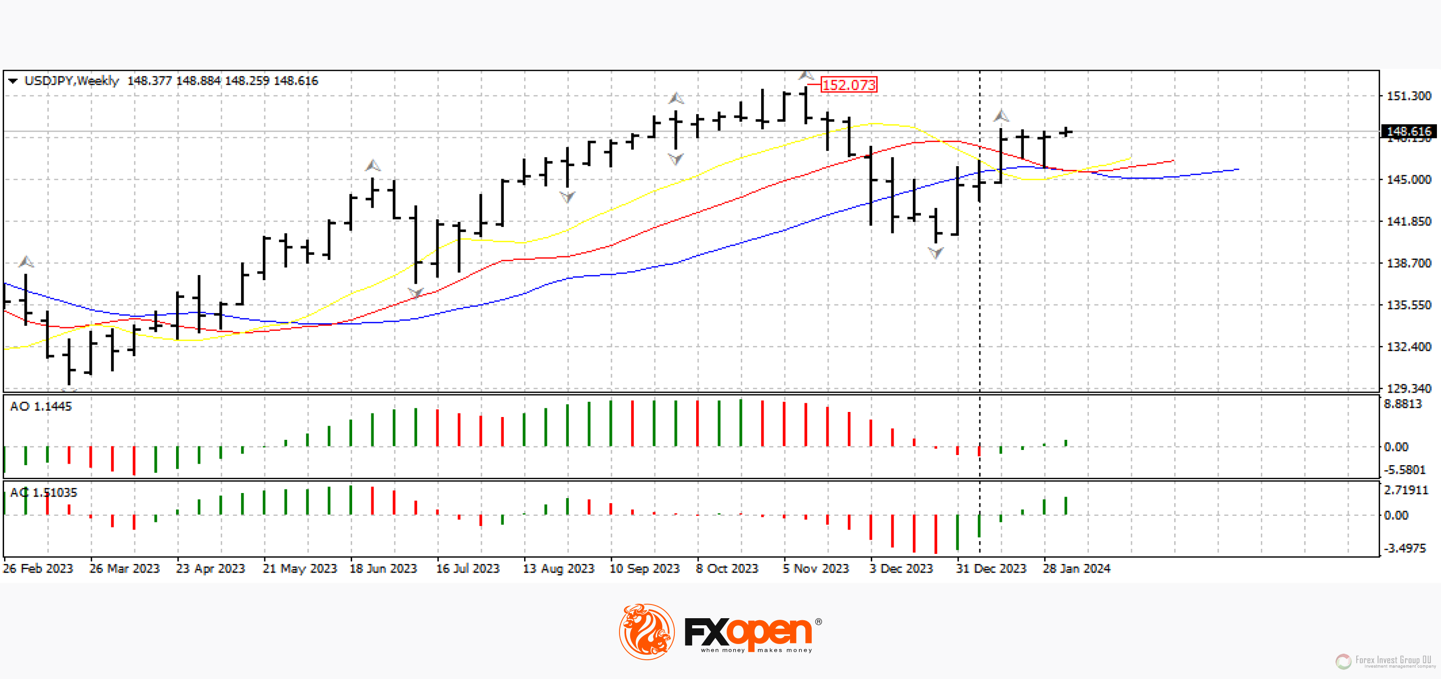 На прошлой неделе пара доллар/иена торговалась у 146 фигуры, но после выхода позитивных данных по занятости сумела укрепиться выше 148.00. На графике USD/JPY цена обновила январские максимумы текущего года. Если покупателям доллара удастся удержаться выше 148.00, цена может продолжить рост в направлении 151.00-150.00. Отменой восходящего сценария может стать уход ниже минимума прошлой недели у 145.80.