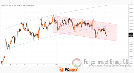 Если тенденция продлится, цена GBP/USD может опуститься до нижней границы красного канала, таким образом установив минимум 2024 года.