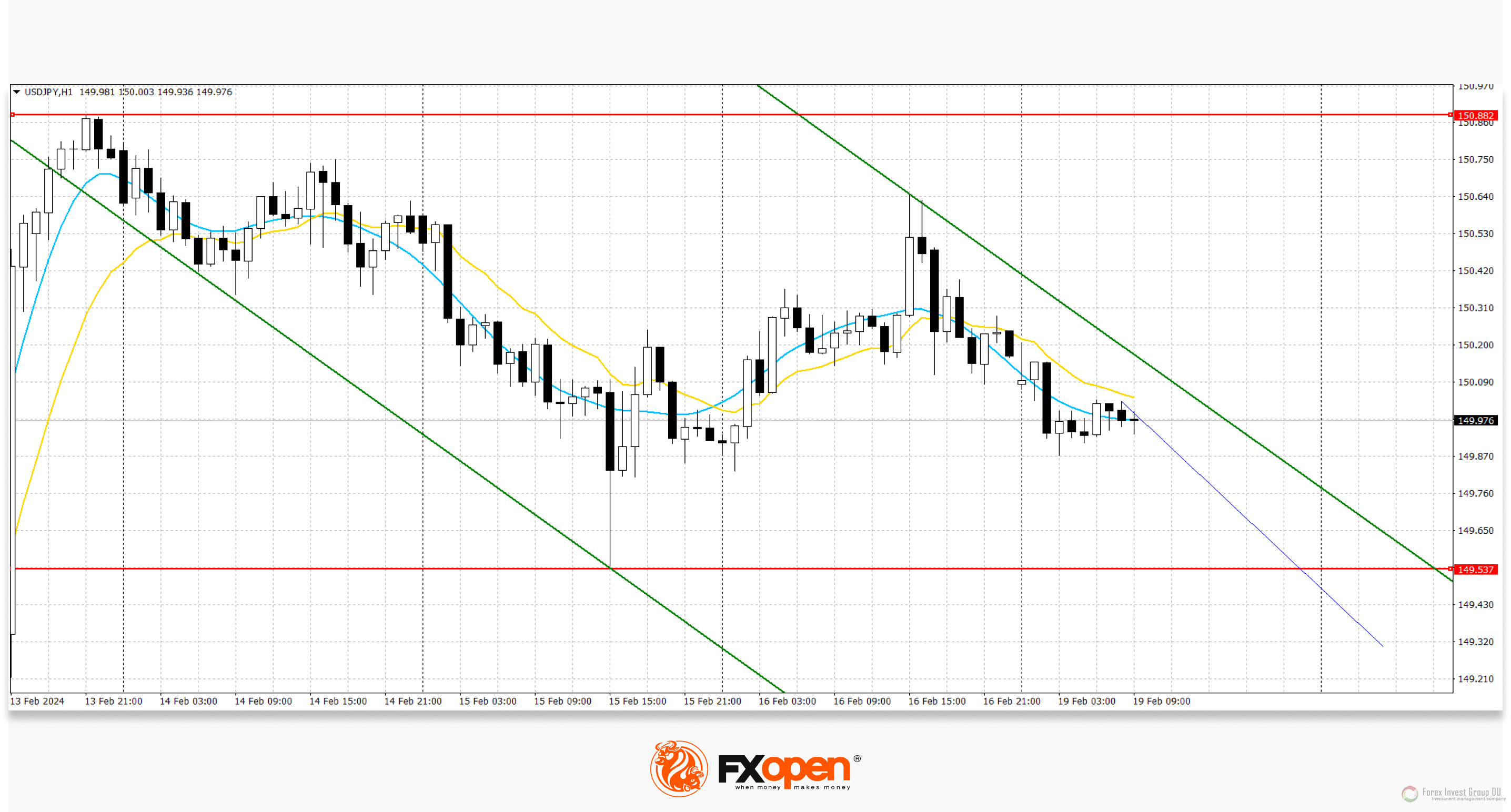 Доллар США показывает нисходящую динамику в паре USD/JPY в ходе азиатской сессии, удерживаясь вблизи психологической отметки в 150.00. Сильное сопротивление можно увидеть на отметке 150,88, прорыв вверх может спровоцировать рост к 151,20. С другой стороны, ближайшая поддержка на графике USD/JPYвидна на отметке 149,53. Прорыв ниже может привести пару к отметке 148,80.
