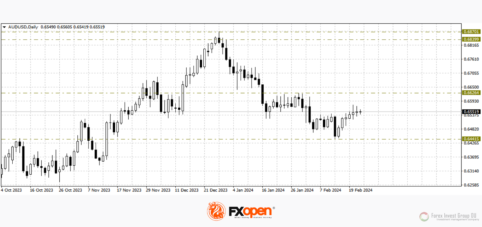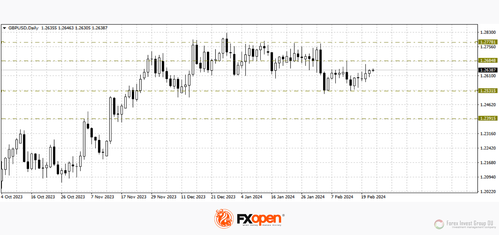 FxSignal 22-02-2024, 13:00 388 Аналитика, прогнозы валютного рынкаФундамент последних торговых сессий способствовал небольшому укреплению сырьевых и европейских валют. Так, пара aud/usd после формирования комбинации “бычье поглощение” сумела уверенно закрепиться выше 0.6500. Валютная пара фунт/доллар повторно протестировав поддержу у 1.2540 и ушла выше 1.2600, а продавцы гринбек в паре доллар/канадец пытаются сломать поддержку у 1.3500.