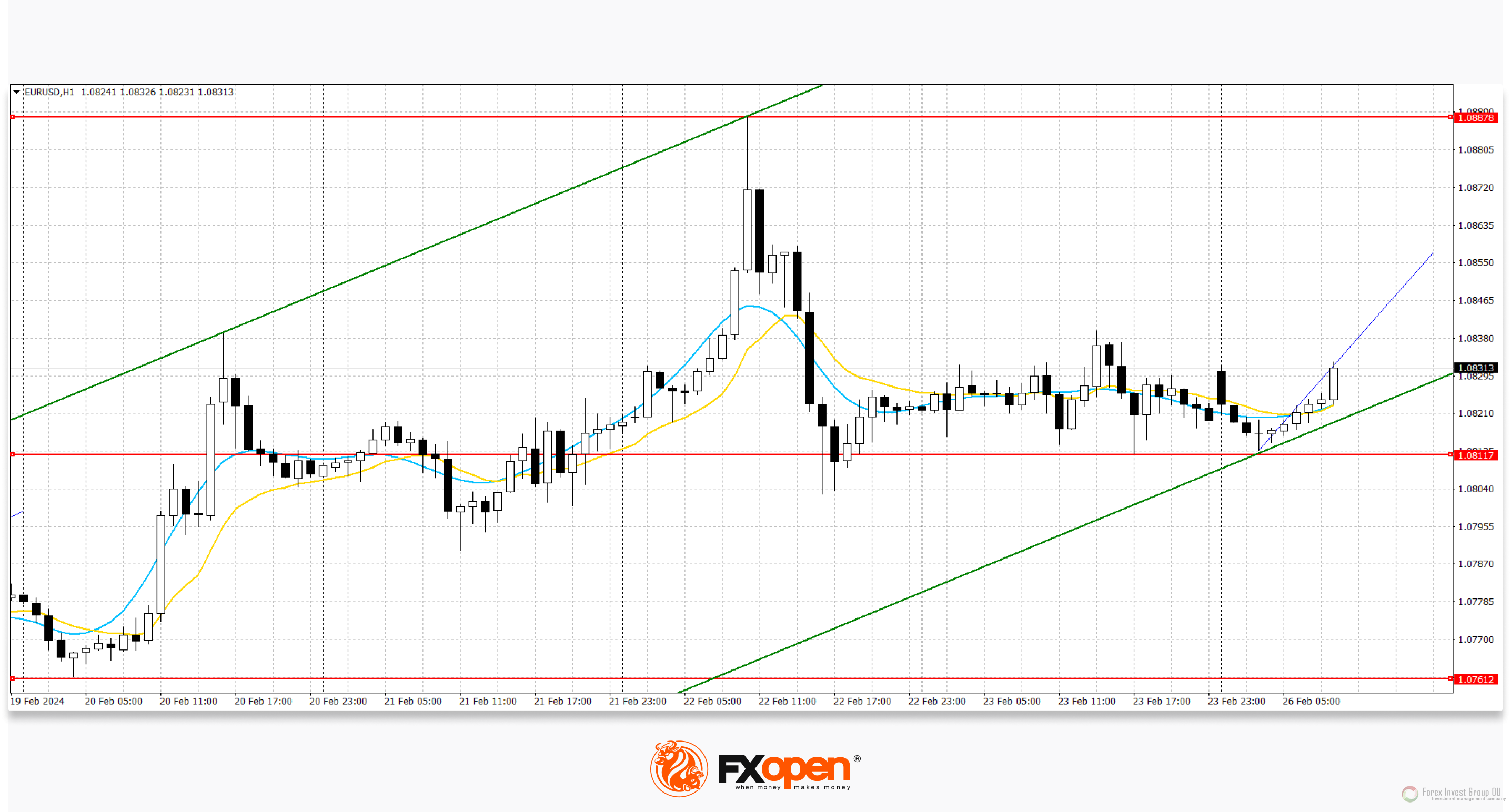 Сегодня инвесторы обратят внимание на выступление главы ЕЦБ Кристин Лагард. В ЕС в конце недели будут представлены февральские данные по динамике инфляции: предполагается замедление индекса потребительских цен с 2,8% до 2,5% в годовом выражении, а базового показателя — с 3,3% до 2,9%. Трейдеры продолжают оценивать сведения из Германии по ВВП и уровню делового оптимизма, опубликованные в пятницу. Так, немецкая экономика в четвёртом квартале 2023 года потеряла ещё 0,3% в квартальном исчислении и 0,4% в годовом. Индекс делового оптимизма IFO в феврале скорректировался с 85,2 пункта до 85,5 пункта, что совпало с прогнозами аналитиков, индикатор оценки текущей ситуации остался на отметке 86,9 пункта при ожиданиях на уровне 86,7 пункта, а индекс экономических ожиданий вырос с 83,5 пункта до 84,1 пункта, тогда как эксперты предполагали 84,0 пункта.