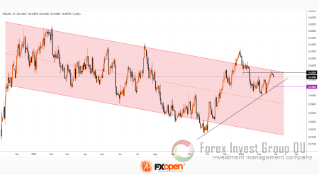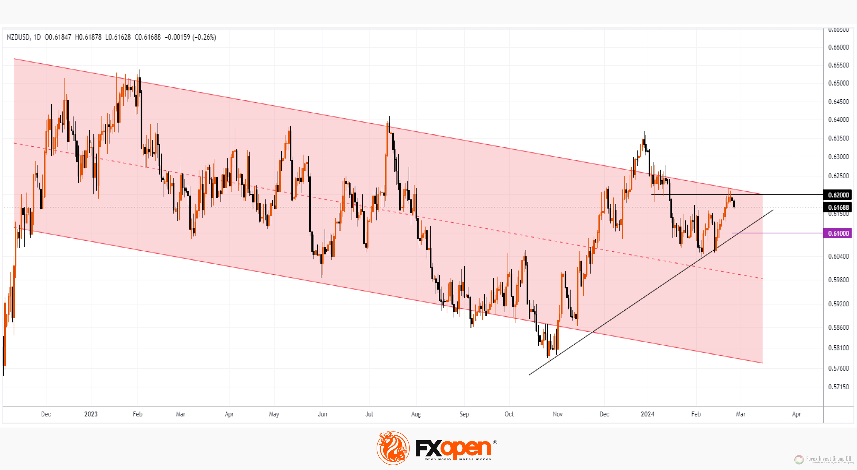 Отметим, что в 2023 году цена NZD/USD вела себя по-медвежьи, сформировав нисходящий канал (показан красным цветом).