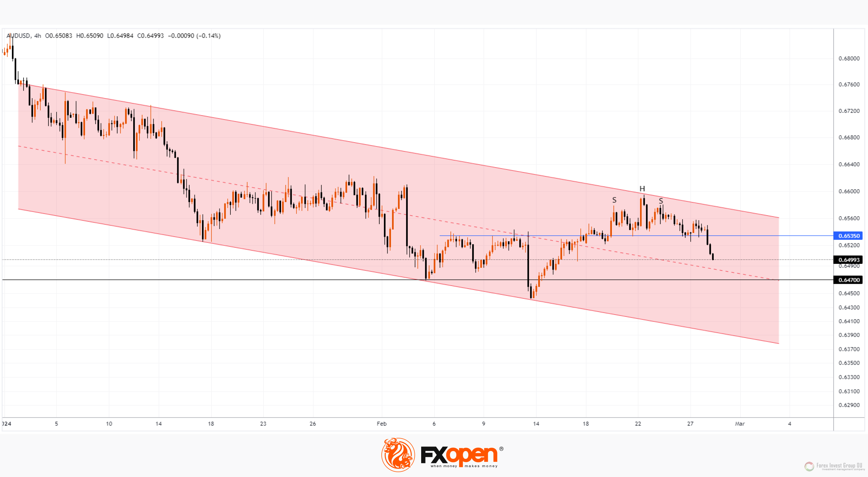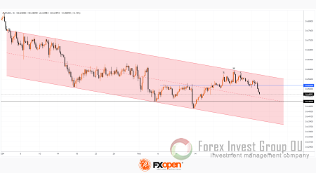 → цена AUD/USD продолжает развиваться в нисходящем канале (показан красным цветом);