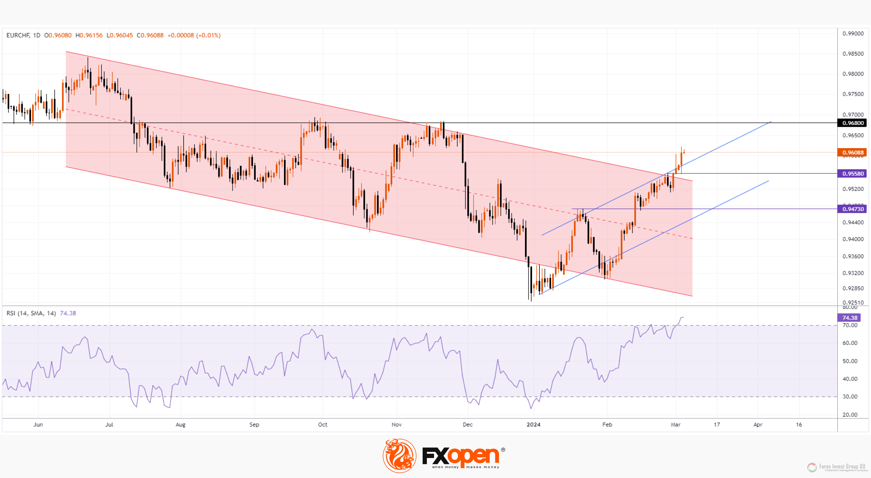 Таким образом участники рынков могут ожидать более мягкой политики и доступного франка – поэтому CHF ослаб относительно ряда валют. Например, курс EUR/CHF достиг максимума с ноября 2023 года.