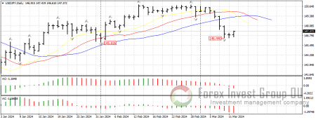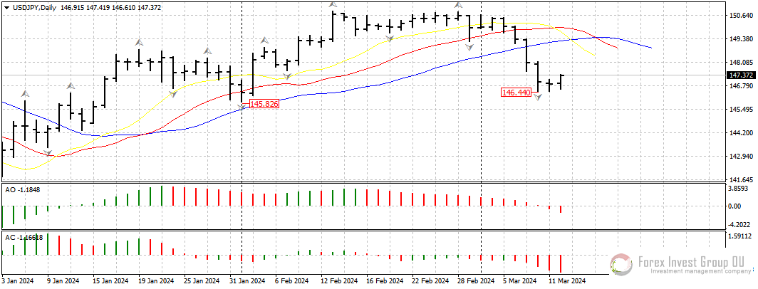 Валютная пара usd/jpy в конце прошлой недели упала к 146.50. Вчера покупатели пары сумели вернуть цену выше 147.00, но полноценного развития восходящей коррекции пока не наблюдается. Если паре удастся закрепиться выше 148.00, цена может протестировать сопротивление у линий аллигатора на недельном таймфрейме вблизи диапазона 149.50-149.00. Обновление недавнего минимума на графике USD/JPY может спровоцировать обвал к экстремумам текущего года у 146.00-145.80.