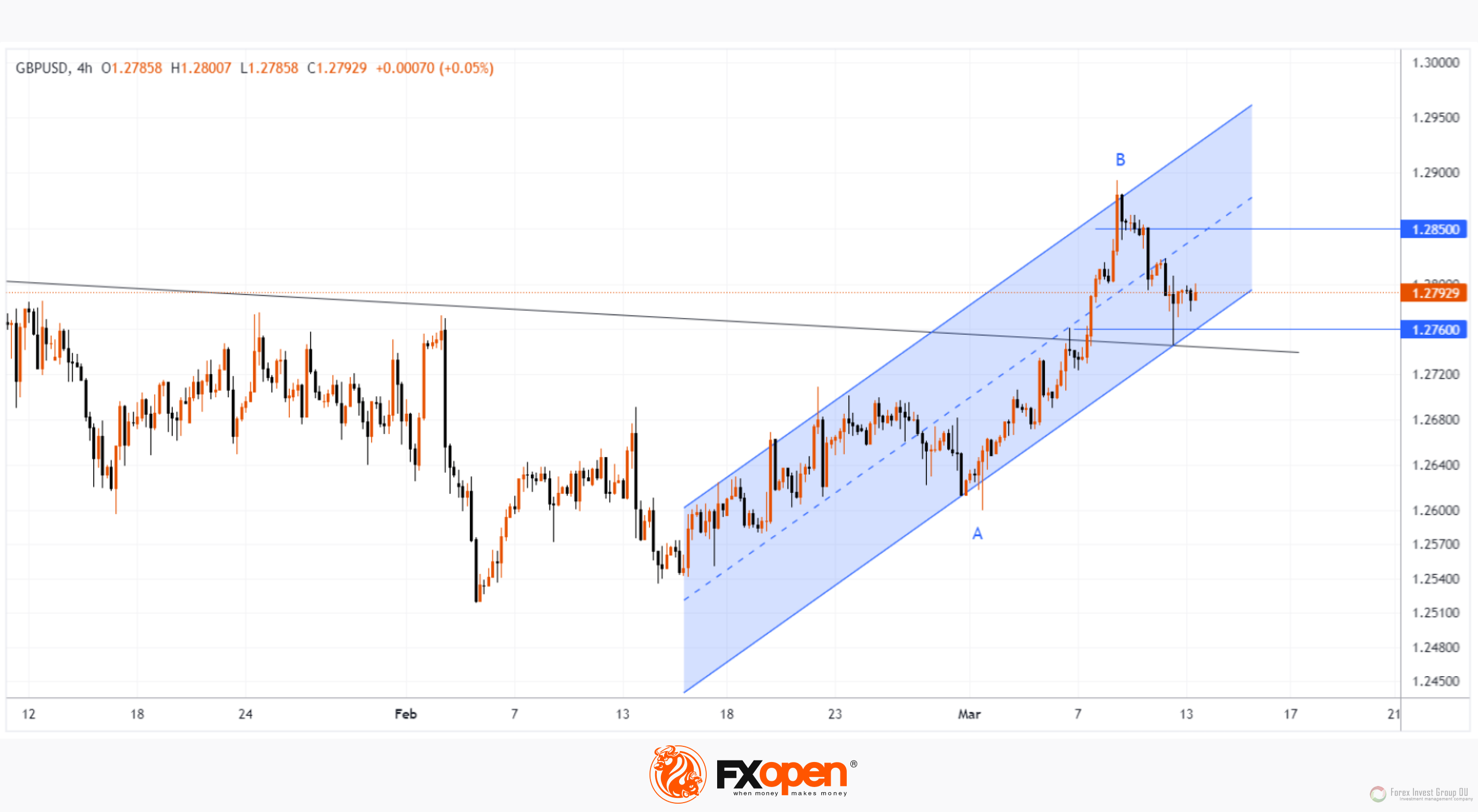 → Не исключено, что сопротивлением выступит уровень 1.285, служивший локальной поддержкой 10-11 марта, и в районе которого (пока что) проходит медианная линия синего восходящего канала.