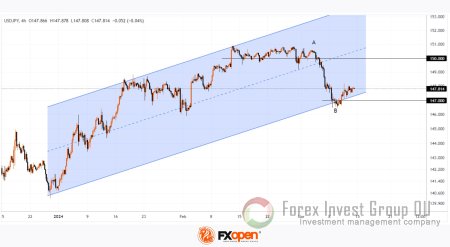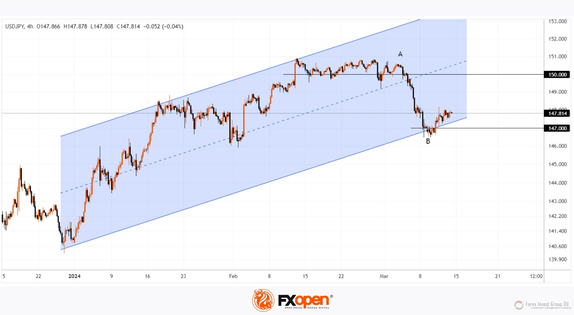 FxSignal 14-03-2024, 16:00 361 Аналитика, прогнозы валютного рынкаС начала 2024 года цена USD/JPY находилась в восходящем тренде (как показано каналом синего цвета), но когда курс превысил психологический уровень 150 иен за доллар, настроения на рынке изменились. Это произошло из-за ожиданий того, что Банк Японии выведет процентную ставку из отрицательной зоны – и заявления официальных лиц давали четкие указания на реализацию этой вероятности.