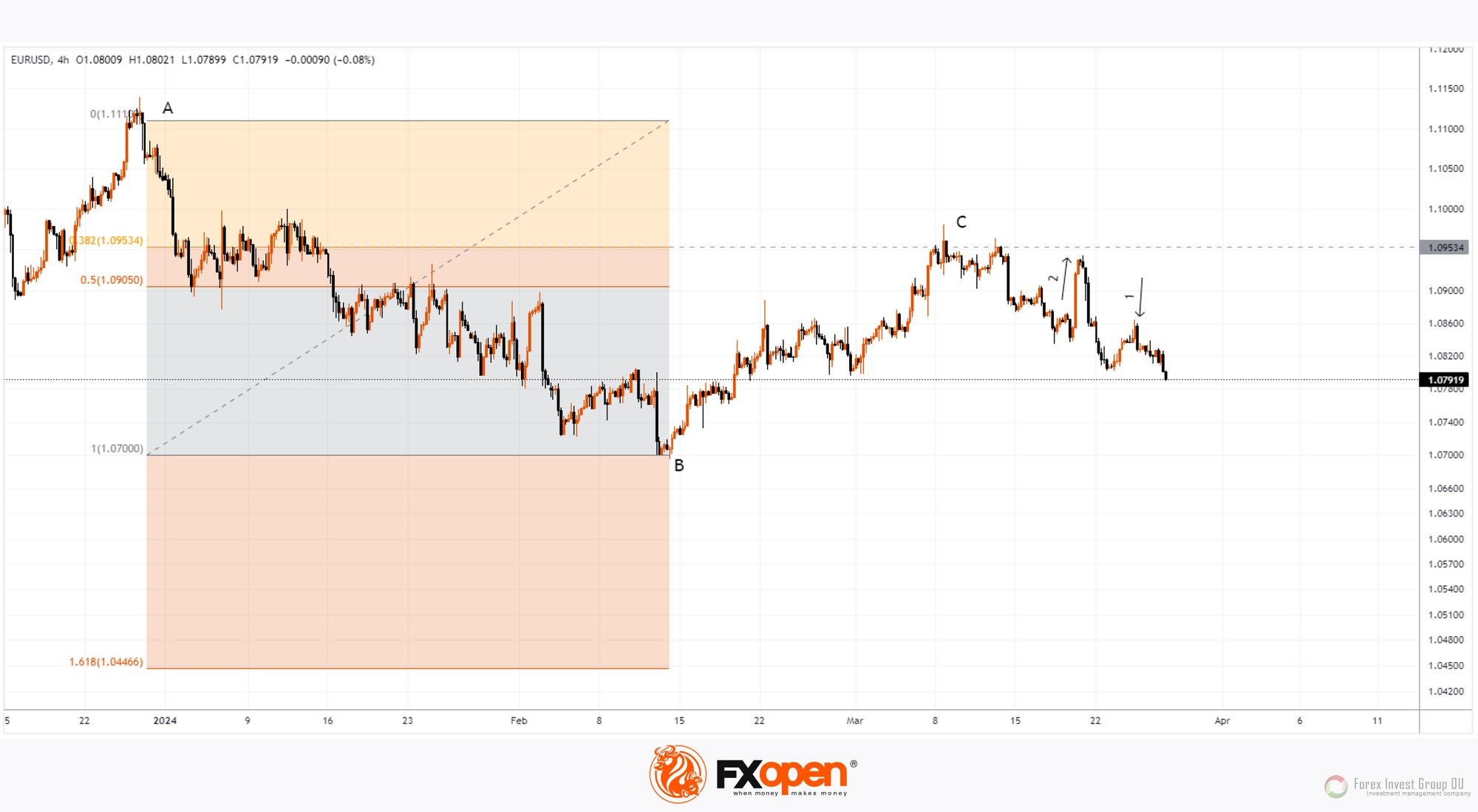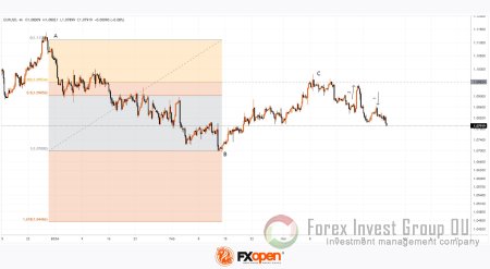 Технический анализ EUR/USD дает еще один аргумент: повышение В→С остановилось у уровня Фибоначи 0.382, образованного от снижения А→В. Таким образом, по теории волн и пропорций Фибоначчи, текущее снижение может достичь уровня 1.618, что приблизительно соответствует минимуму 2024 года.