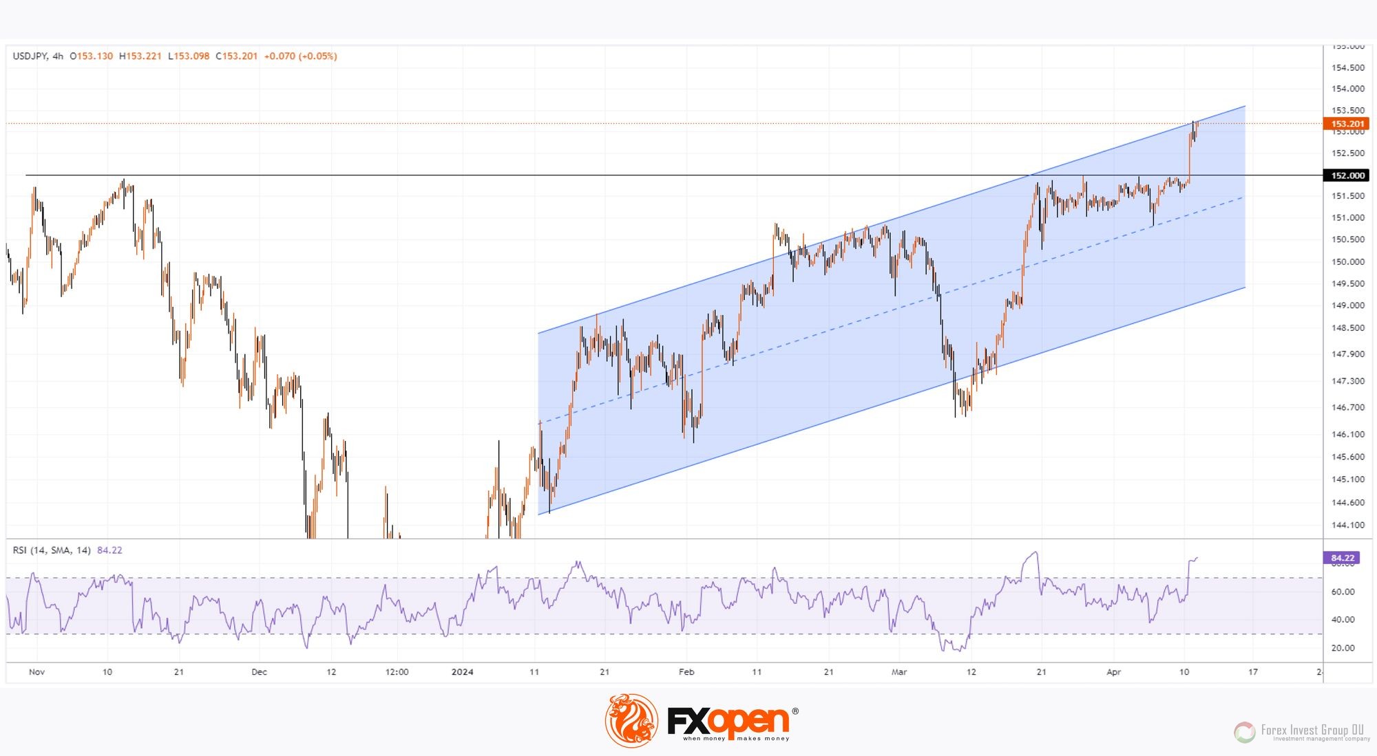 FxSignal 11-04-2024, 12:00 394 Аналитика, прогнозы валютного рынкаСегодня утром курс USD/JPY находится в районе 153.20 иен за доллар США, чему способствовало резкое укрепление доллара на фоне новостей об инфляции в США. Таким образом иена ослабла до уровней, которые в последний раз наблюдались в середине 1990 года.