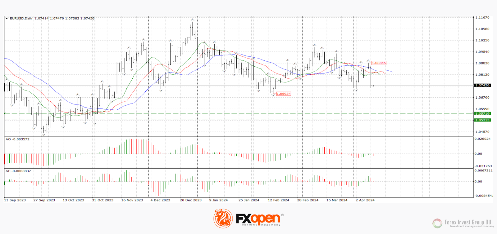 Технический анализ EUR/USD показывает, что если нисходящий тренд продолжится, пара может уйти ниже 1.0690 и продолжить нисходящее движение в направлении 1.0570-1.0530.