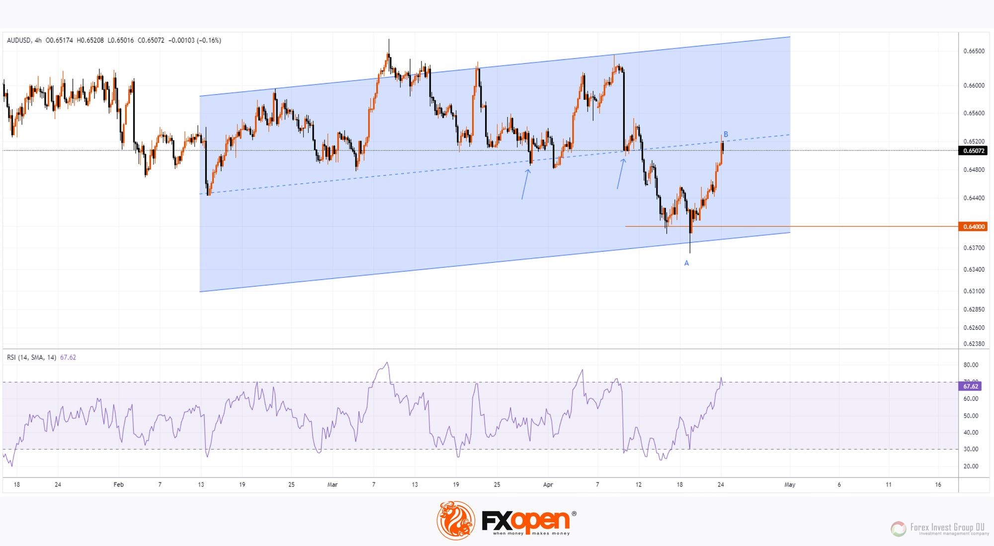 Не исключено, что в краткосрочной перспективе произойдет коррекция после резкого роста цены AUD/USD – например, на 50% от импульса А→В.