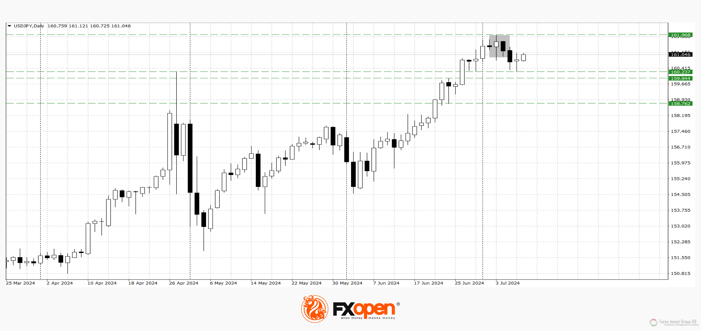 Технический анализ пары USD/JPY указывает на возможность продолжения нисходящей коррекции, так как на дневном таймфрейме сформирована комбинация “медвежье поглощение”. Формацию можно считать частично отработанной, так как с момента формирования цена снизилась более чем на 100 пп и почти протестировала важную поддержку у 160.00.