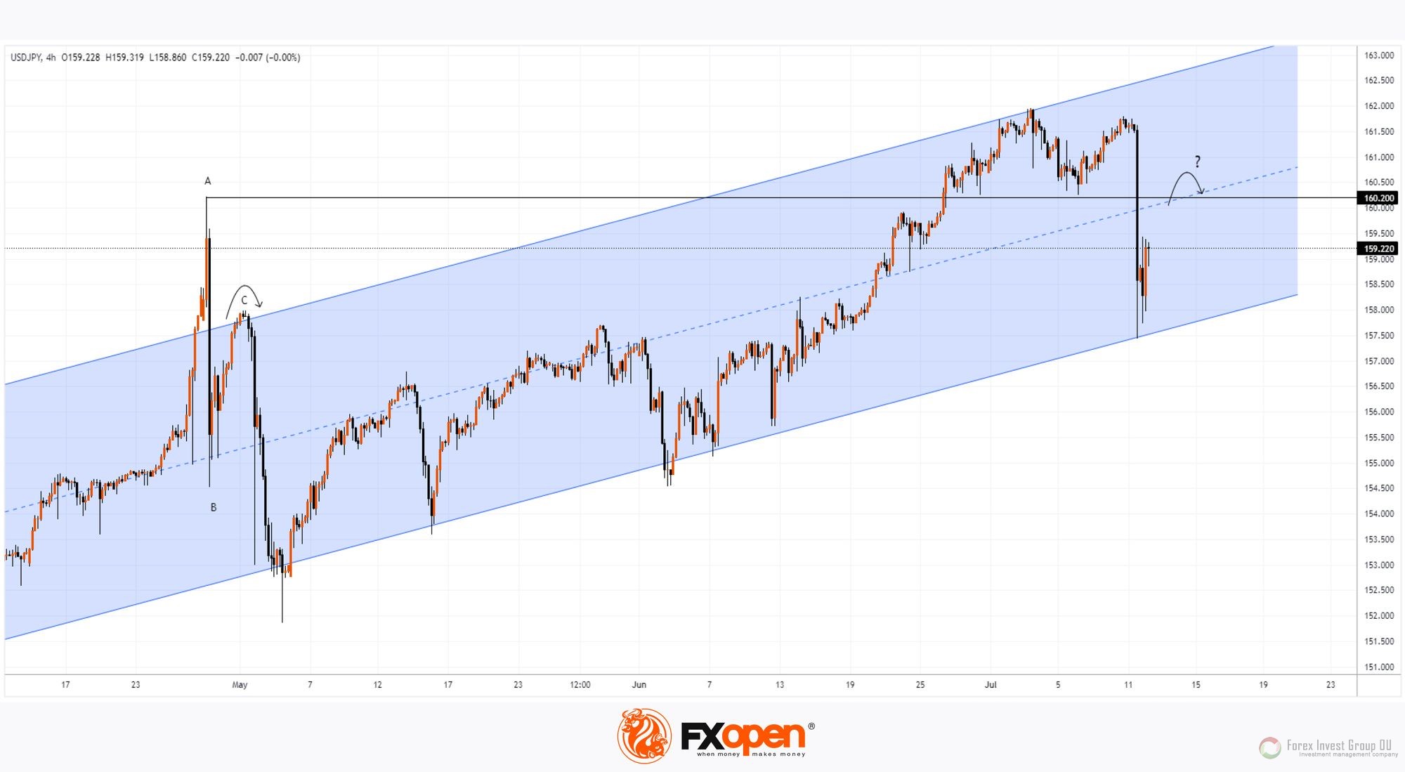 В свою очередь курс USD/JPY снизился, однако движение было более агрессивным. Как свидетельствует график, доллар ослаб относительно иены приблизительно на 1.8% в первые 15 минут после публикации. Это дает повод предполагать, что на фоне новостей из США Банк Японии провел интервенции, поддерживая свою валюту, которая не опускалась ниже уровня 160 иен за USD с 26 июня.