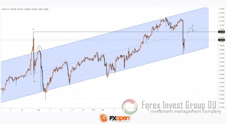 Если цена USD/JPY будет действовать по аналогичному сценарию, мы можем увидеть восстановление к блоку сопротивлений, который образуют медианная линия синего канала и уровень 160.20 (построенный от максимума апреля), и последующее формирование закругления с активизацией медведей (показано стрелкой с вопросом).