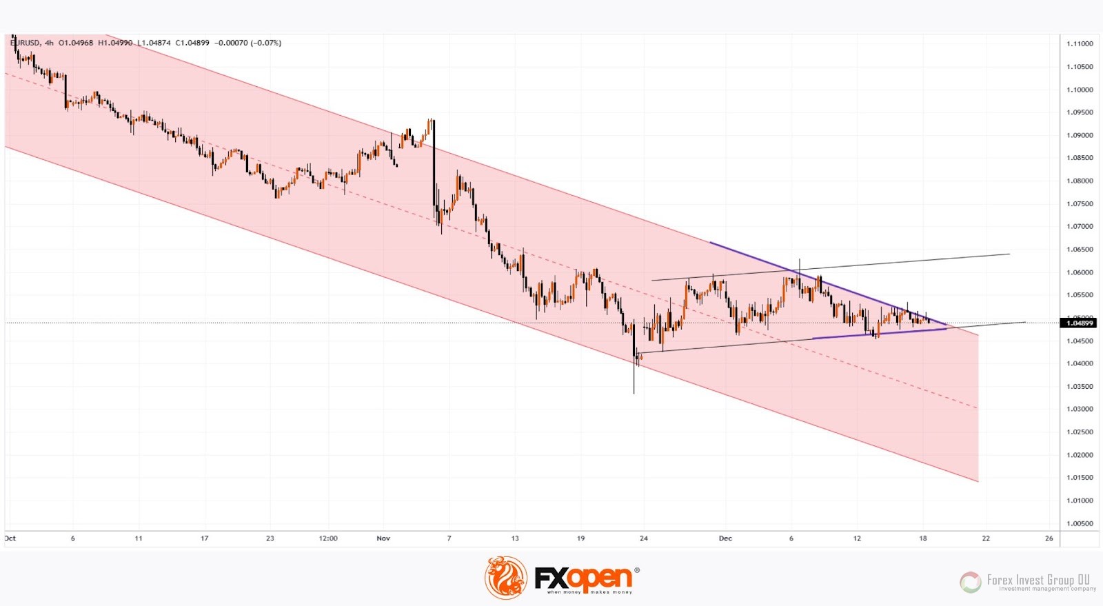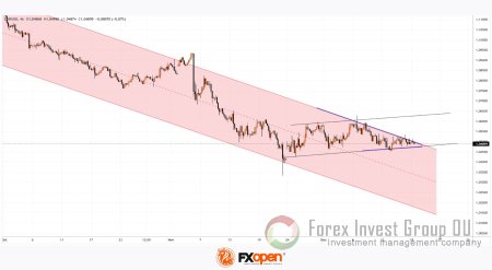 Технический анализ график EUR/USD показывает, что курс евро к доллару США консолидируется между верхней границей нисходящего канала и нижней черной линией поддержки, что образует фигуру сужающегося треугольника (показан фиолетовыми линиями).