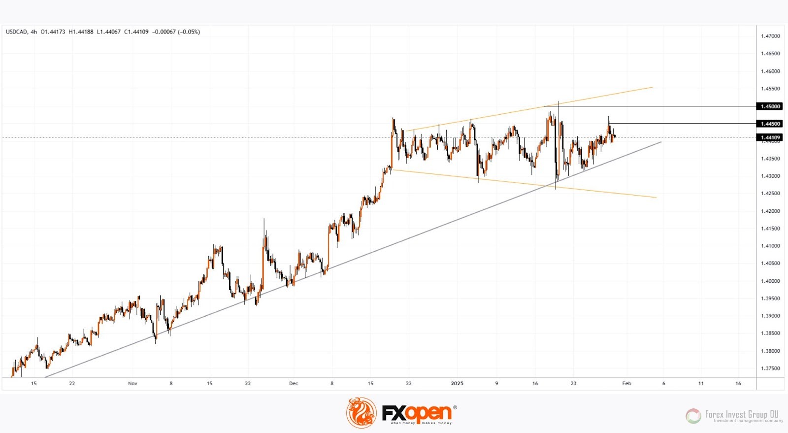 Не исключено, что активность продавцов приведет к тому, что курс USD/CAD опустится к важной трендовой линии (показана серым цветом), сформировавшейся во второй половине 2024 года.