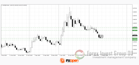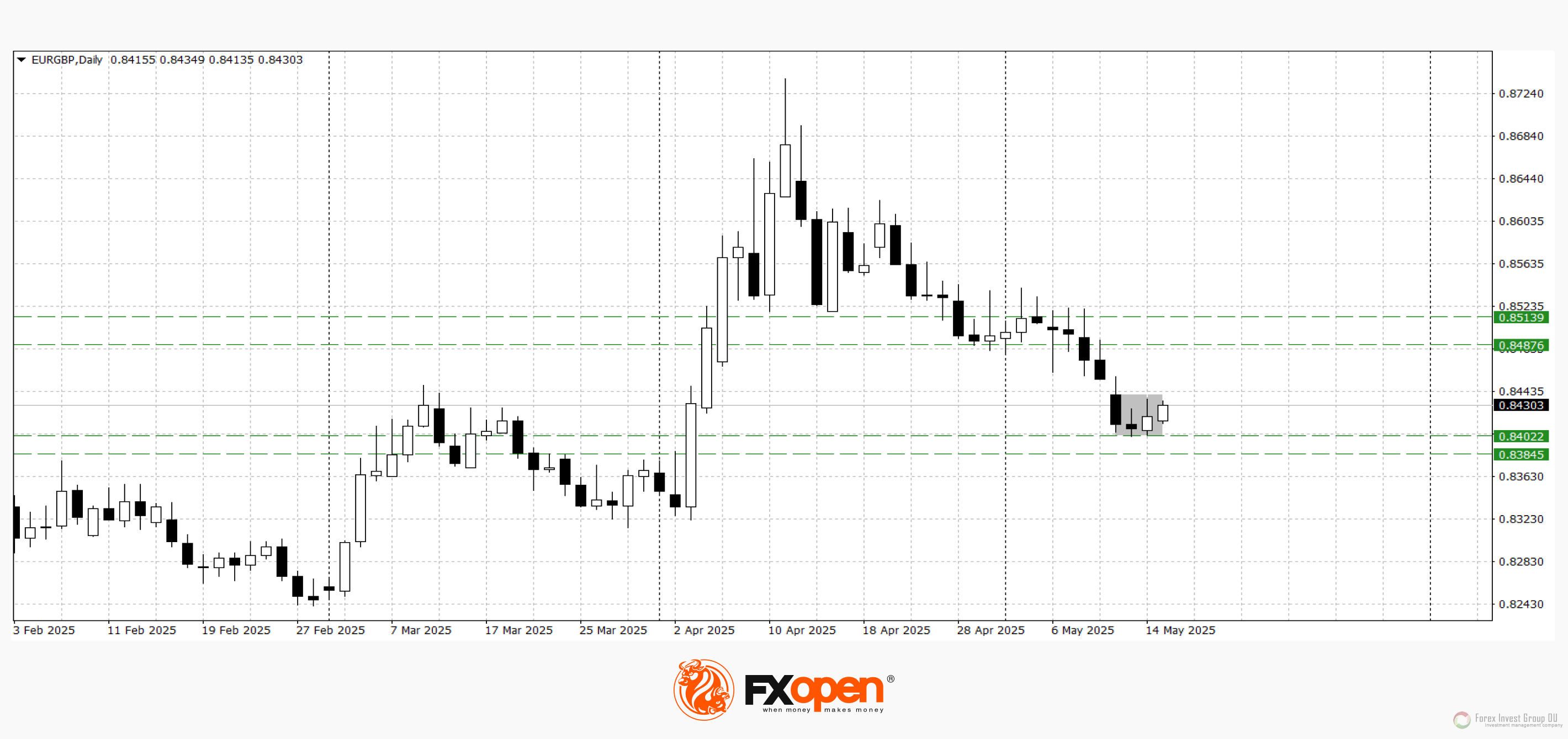 После резкого снижения в апреле от отметки 0.8720 пара EUR/GBP нашла поддержку у 0.8400, отражая сбалансированные ожидания по экономическим перспективам еврозоны и Великобритании. Волатильность пары остается ограниченной в преддверии новых макроэкономических ориентиров. Технический анализ EUR/GBP свидетельствует о возможном укреплении в направлении 0.8500-0.8470, так как на дневном таймфрейме сформирована комбинация “бычье поглощение”.