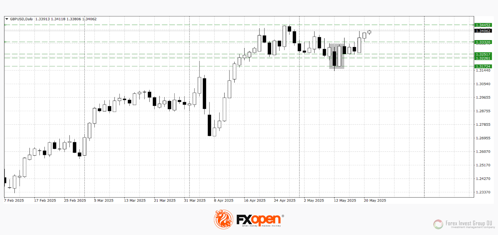 Пара GBP/USD укрепилась до уровня 1.3400, продолжая восходящее движение после формирования комбинации “бычье поглощение” от 12 мая. Импульсный пробой уровня 1.3365 и закрепление выше него усиливают бычий сценарий с целью обновления максимумов на уровне 1.3445. Важный диапазон поддержки находится на уровне 1.3340-1.3320, и её пробой может привести к повторному тесту ценой важного диапазона 1.3260-1.3230.