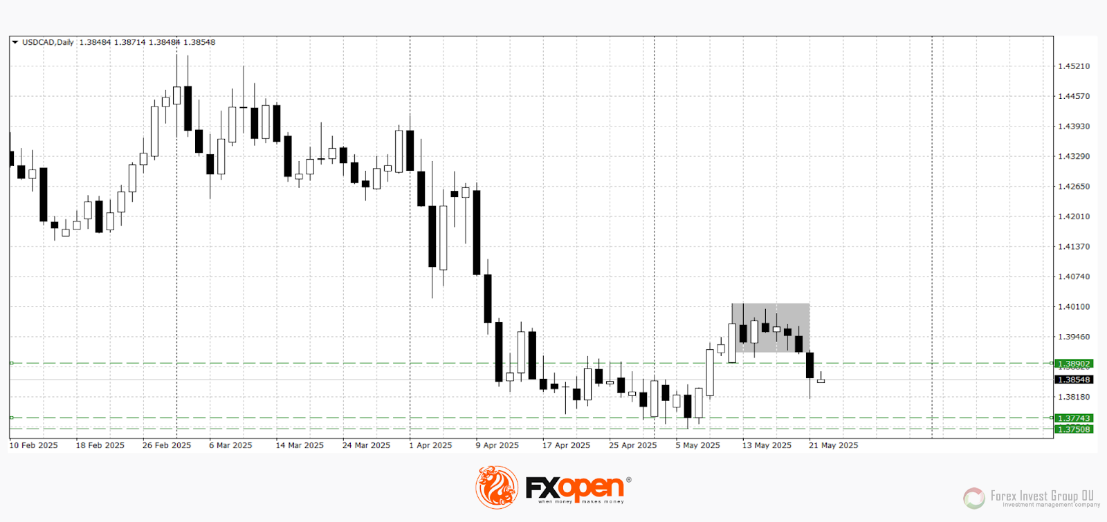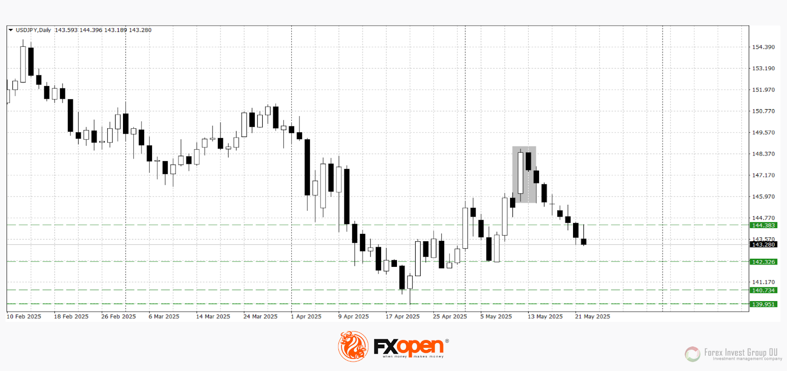 FxSignal 22-05-2025, 11:00 316 Аналитика, прогнозы валютного рынкаВалютные пары USD/CAD и USD/JPY продолжают демонстрировать нисходящую динамику, приближаясь к минимумам текущего года. Снижение доллара обусловлено усилением обеспокоенности инвесторов по поводу фискальной устойчивости США и неопределённости в торговых отношениях с ключевыми партнерами. На прошлой неделе агентство Moody’s пересмотрело кредитный рейтинг США, снизив его еще на одну ступень. Решение было обусловлено ростом обеспокоенности по поводу фискальной устойчивости страны: госдолг США превысил отметку в 36 триллионов долларов, а перспективы его сокращения остаются неясными. Рынок отреагировал усилением давления на доллар — инвесторы пересматривают свои ожидания по отношению к американским активам, что отражается в снижении интереса к доллару в краткосрочной и среднесрочной перспективах.