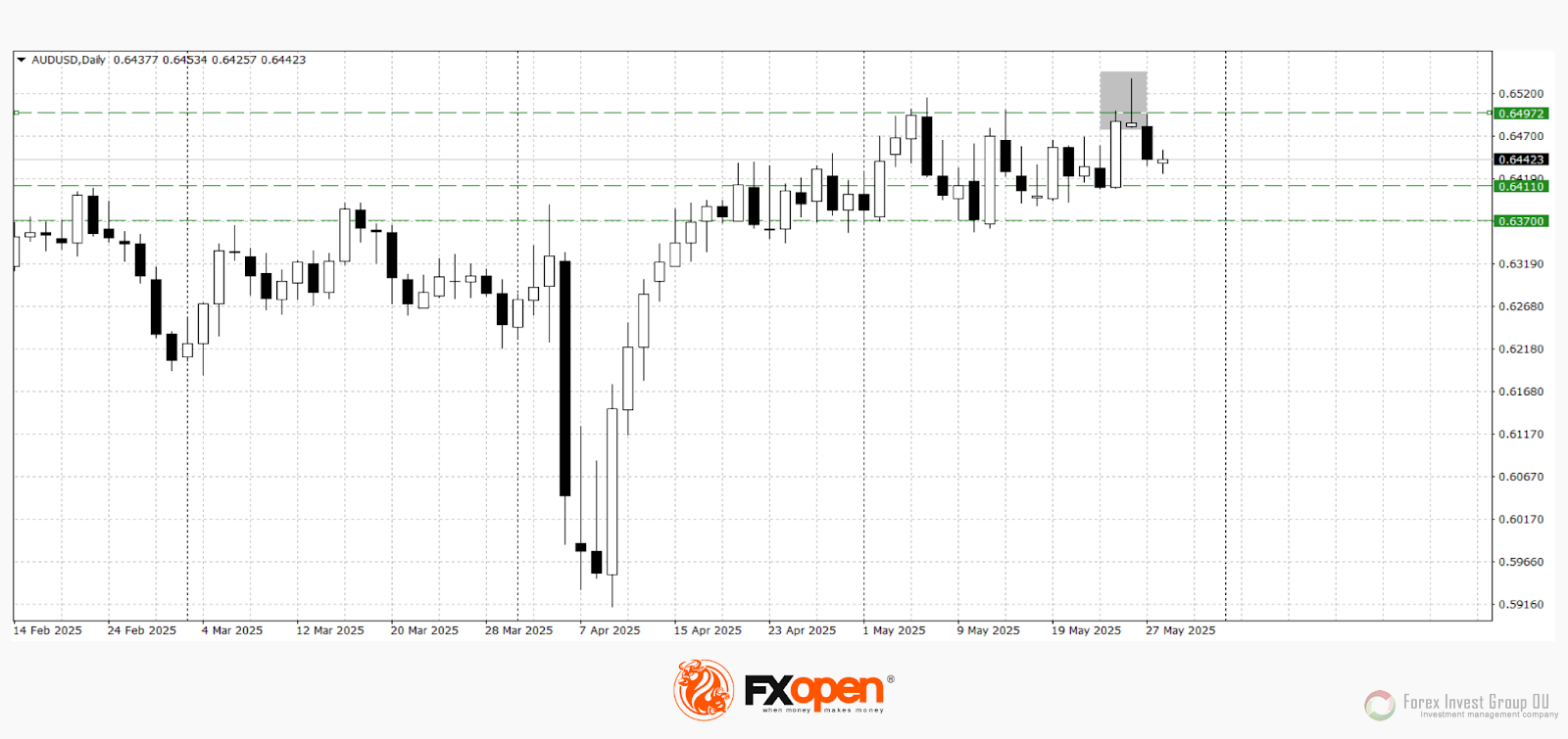 FxSignal 28-05-2025, 15:00 236 Аналитика, прогнозы валютного рынкаВалютные пары AUD/USD и NZD/USD демонстрируют коррекционное снижение после достижения среднесрочных максимумов в начале недели, на фоне общей переоценки рисков в ожидании публикации протоколов последнего заседания ФРС. Инвесторы и участники рынка сокращают позиции в рисковых активах, реагируя на совокупность факторов, включая монетарные сигналы, геополитическую риторику и тарифную политику.