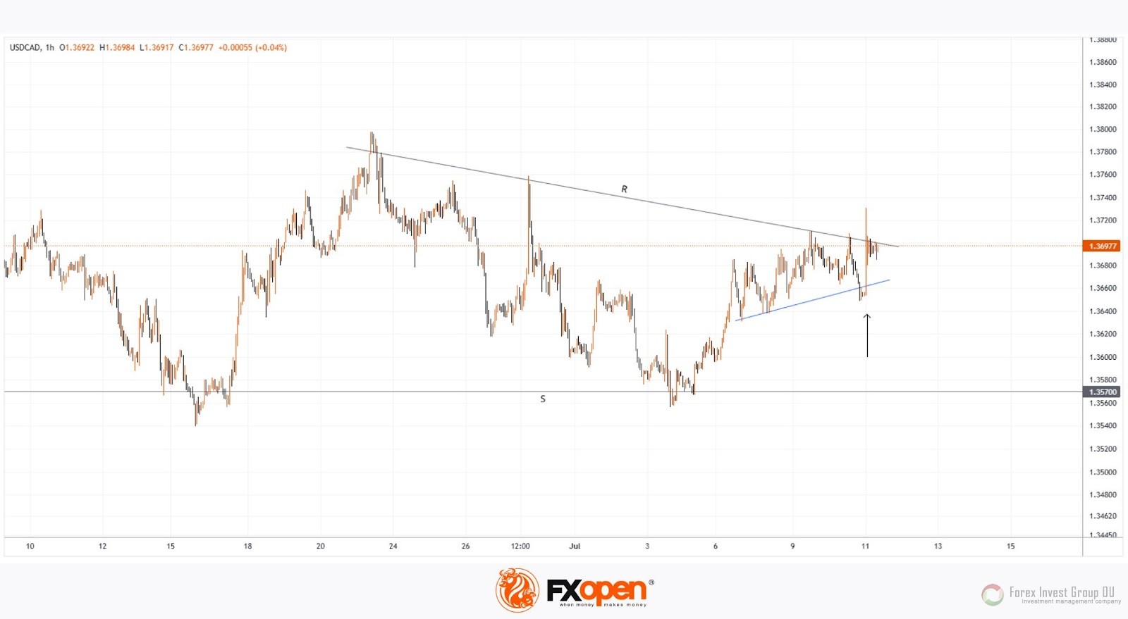 В то же время колебания курса USD/CAD в начале июля дают основания провести локальную поддержку (отмечена синей линией). Таким образом, сегодня допустимо говорить о консолидации цены в рамках формации между синей линией поддержки и линией сопротивления R.