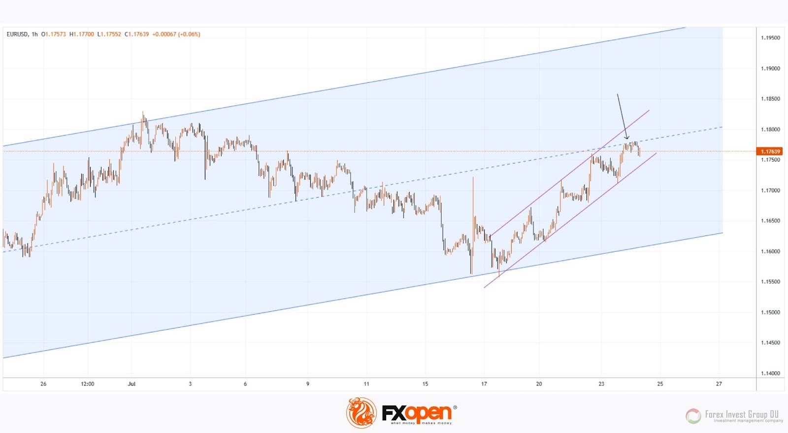 С точки зрения технического анализа графика EUR/USD, курс демонстрирует бычью динамику начиная с июня. Это привело к формированию восходящего канала (показан синим цветом).