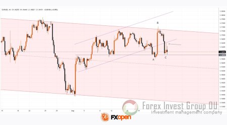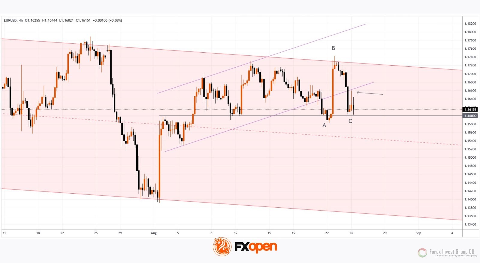 FxSignal 26-08-2025, 14:00 111 Аналитика, прогнозы валютного рынкаРечь Пауэлла в пятницу имела выраженный “голубиный” тон. Ожидания снижения процентной ставки усилились, что привело к резкому ослаблению доллара – на графике EUR/USD образовался бычий импульс А→В.