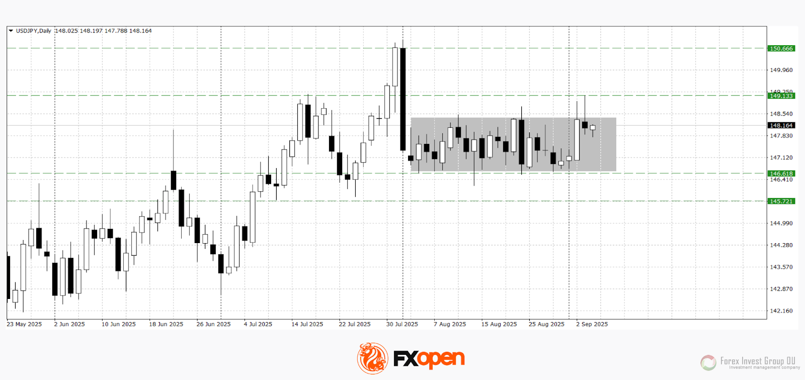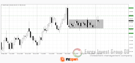 После формирования USD/JPY Вчера покупатели USD/JPY предприняли очередную попытку выйти из среднесрочного флетового коридора 146.40–148.60. Тест 149.00 завершился резким откатом и возвращением цены в ранее сформированный диапазон. Судя по всему, инвесторы воздерживаются от новых позиций в ожидании свежих данных. Повлиять на вектор движения USD/JPY могут следующие события: Торгуйте более чем 50 валютными парами 24 часа в сутки с FXOpen. Воспользуйтесь низкими комиссиями, глубокой ликвидностью и спредами от 0,0 пипса. [url=https://fxopen.com/ru/open-account//?agent=XX54FXPNXXG6008310001]Откройте счет