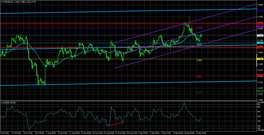 Валютная пара EUR/USD в течение понедельника немного откатилась вверх после преодоления скользящей средней линии. Напомним, что концовка прошлой недели выдалась достаточно хмурой для европейской валюты, хотя ничего экстраординарного не произошло. Европейская валюта суммарно подешевела на 150 пунктов, что вряд ли можно считать каким-то провалом единой европейской. Другой вопрос, что особых причин для падения у валюту ЕС не было. Однако, даже если таких причин действительно не было, мы увидели банальную техническую коррекцию. Так как причины падения евровалюты на текущий момент с точностью установить нельзя, многие аналитики начинают строить предположения «из воздуха». К примеру, популярной точкой зрения сейчас является снижение евровалюты на фоне протестов и беспорядков во Франции. Скажем откровенно, протесты могли спровоцировать давление на европейскую валюту, вот только подобные события в Европе происходят достаточно часто. За последние пару лет только во Франции беспорядки фиксировались уже несколько раз. То же самое касается и политических кризисов. Каждые три месяца какой-нибудь высокопоставленный чиновник покидает свой пост или же подвергается жесткой критике. К примеру, в то же Франции за последние 2 года поменялось 5 министров финансов. Ранее правительство Олафа Шольца(Германия) вынуждено было уйти в отставку. В Великобритании за последние 10 лет ни один из премьер-министров не доработал свой срок до конца. Как видим, подобные события – мягко говоря, не редкость. И, что самое интересное, в Штатах тоже регулярно происходят протесты, случаются «громкие» увольнения, страна регулярно не может решить бюджетные вопросы, из-за которых возникает угроза шатдауна. Таким образом, подобные события происходят в мире достаточно часто, и мы не считаем, что падение европейской валюты следует связывать именно с ними. На текущий момент можем сказать лишь одно – несмотря на закрепление цены ниже мувинга, ничего для пары EUR/USD не изменилось. Даже на 4-часовом ТФ отлично видно, что пара продолжает двигаться точно в том же русле, что и полтора месяца до этого. Восходящее движение сейчас не такое сильное, как в первом полугодии, поэтому цена регулярно откатывается вниз, а эксперты судорожно пытаются найти объяснение такому движению. Напомним трейдерам, что далеко не каждое движение на рынке происходит «потому что». Цена образовывается из спроса и предложения. Представим себе, что некий крупный игрок захотел приобрести крупную сумму долларов на рынке, расплачиваясь при этом евровалютой. Он провел сделку, курс пары просел. Разве для такой сделки требовались определенные фундаментальные, макроэкономические или политические причины? Сделки на валютном рынке проводятся не только с целью спекуляции и получения прибыли, вопреки расхожему мнению. Таким образом, мы увидели банальный нисходящий откат, который просто случился в не совсем подходящее время, вынуждая участников рынка искать причину, хотя в этом нет никакой необходимости. Средняя волатильность валютной пары EUR/USD за последние 5 торговых дней по состоянию на 23 сентября составляет 91 пункт и характеризуется, как «средняя». Мы ожидаем движение пары между уровнями 1,1683 и 1,1865 во вторник. Старший канал линейной регрессии направлен вверх, что по-прежнему указывает на восходящую тенденцию. 