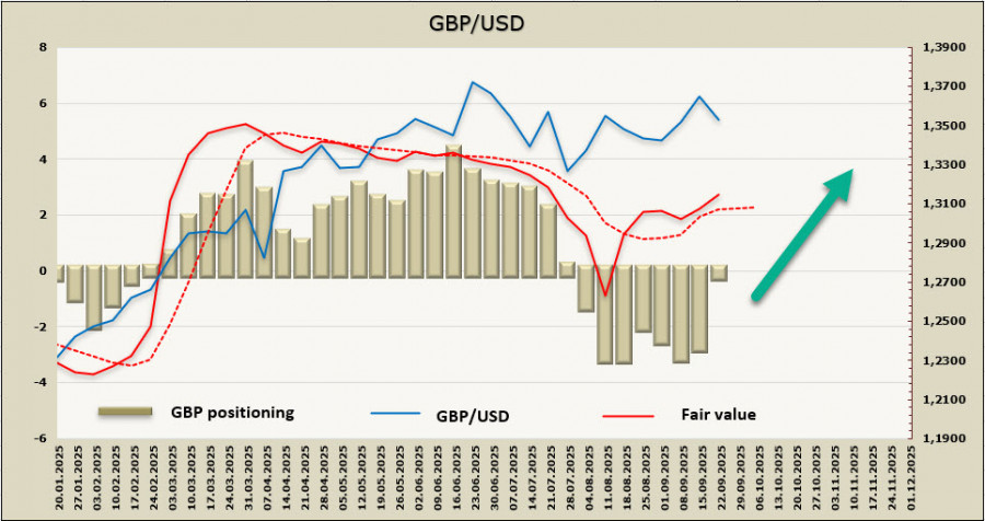 Поскольку Банк Англии не стал использовать более ястребиные формулировки, рыночные ожидания по дальнейшей траектории ставки не изменились, и следующее снижение ожидается в ноябре, а в феврале ставка снизится до 3.50%. Здесь та же история, что и с ФРС – ставка предположительно продолжит снижение на фоне угрозы роста инфляции, что само по себе необычно, если не сказать странно. Для дальнейшего снижения ставки (напомним, что если рынок считает, что ставка будет снижаться и далее, то это обычно оказывает давление на валюту) нужна уверенность в том, что инфляция будет снижаться или как минимум не повышаться. Опубликованный перед заседанием индекс потребительских цен за август показал минимальное замедление базового индекса с 3.8% до 3.6% г/г, общий индекс остался без изменений на уровне 3.8%. NIESR прогнозирует что инфляция останется выше 3% до апреля 2026г, а в сентябре может показать 4% или даже 4.2%. Понятно, что такой прогноз не в пользу снижения ставки и в целом дает фунту основания для продолжения роста. Потребительский спрос остается высоким, отчет по розничным продажам за август вышел с превышением прогнозов, что также снижает шансы на снижение ставки, а вот PMI в августе неожиданно снизились и в производственном секторе, и в секторе услуг, что, в свою очередь, грозит росту экономики и требует противоположной реакции от BoE. Пока исходим из того, что фунт сохраняет бычий настрой. Чистая короткая позиция по фунту была практически ликвидирована на отчетной неделе, сокращение на 2.28 млрд. до -561 млн. Позиционирование все еще медвежье, но всё указывает на то, что фунт готовится к рывку вверх, расчетная цена выше долгосрочной средней и так же уверенно смотрит на север.