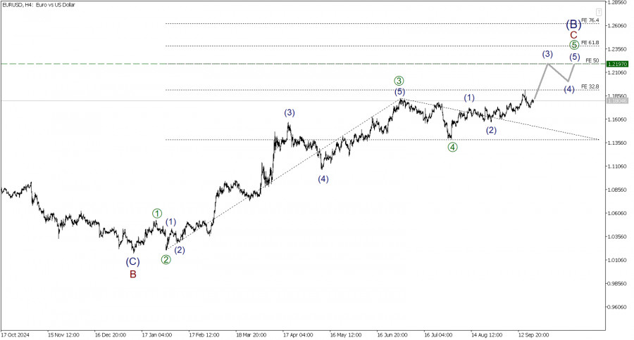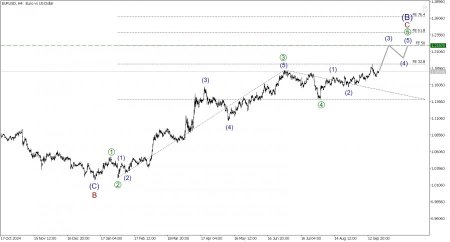 Рынок по Евродоллару в долгосрочной перспективе может формировать крупную бычью коррекция (B), которая принимает форму стандартного зигзага A-B-C. На сегодняшний день полностью завершены только первые две его части - импульс A и коррекция B. На последнем участке графика мы можем наблюдать развитие бычьей волны C, которая, по всей видимости, принимает форму импульса. На текущий момент завершены первые четыре его части - подволны [1]-[2]-[3]-[4]. В процессе построения ,бычья финальная подволна [5]. Большая вероятность, что быки внутри волны [5] смогут отправить рынок в область уровня 1.219. На указанной отметке величина крупной импульсной волны [5] составит 50% по расширению Фибоначчи от предыдущей импульсной волны [3]. Таким образом, при продолжении роста, стоит рассмотреть открытие длинных позиций с текущего уровня, с целью забрать прибыль на указанной отметке. После достижения уровня 1.208, ожидается смена тренда, а именно ожидается развитие финального медвежьего импульса (C). В текущей ситуации рекомендуется рассматривать открытие длинных позиций. Торговые рекомендации: Buy 1.183, takeprofit 1.219.
