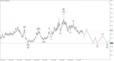 Глядя на текущий график, можно заметить, что по газу может формироваться крупный коррекционный тренд. На текущем графике представлена разметка большой действующей волны (Y), принимающей форму тройного зигзага W-X-Y-XX-Z. На текущем графике мы видим, что действующая волна Z похожа на стандартный зигзаг, внутри которого завершен импульс [A]. Сейчас может формироваться коррекционная подволна [B], которая, судя по всему, принимает форму двойного зигзага (W)-(X)-(Y). Предполагается, что на сегодняшний день завершена только первая действующая волан (W), она приняла форму двойного зигзага W-X-Y. Сейчас в процессе развития может находиться противодействующая волна связка (X), она тоже представляет собой двойной зигзаг W-X-Y. На последнем участке графика может формироваться финальная зигзагообразная волна Y. Внутри волны Y могла подойти к концу коррекционная подволна [B], поэтому в ближайшее время участников рынка может ждать разворот цены и начало падения в импульсе [C]. Вполне возможно, что быки поведут рынок за собой в сторону уровня 1.52. На указанной отметке ранее была завершена подволна [A]. В текущей ситуации можно рассматривать открытие коротких позиций. Торговые рекомендации: Sell 3.11, takeprofit 1.52.