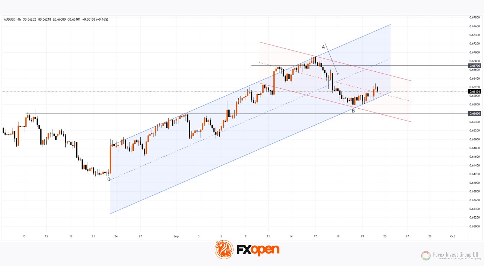 Колебания курса AUD/USD с конца прошлого месяца формируют восходящий канал (показан синим цветом).