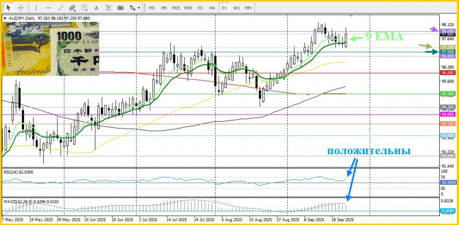 Это создает благоприятные условия для австралийского доллара, который в сочетании с ослаблением японской иены способствует росту кросс-курса AUD/JPY. При этом индекс менеджеров по закупкам (PMI) в производственном секторе Японии (S&P Global) показал крупнейшее снижение с марта, упав в сентябре до 48,4 с 49,7 в августе. Отрицательные данные усугубляются опасениями по поводу экономических трудностей, вызванных американскими пошлинами и внутренней политической нестабильностью, что может подтолкнуть Банк Японии к отсрочке повышения ставок и ослабить иену.