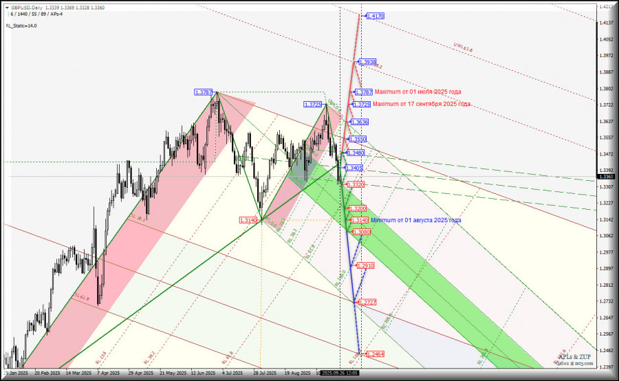 Операционный масштаб Minor (таймфрейм Daily)GBP/USD- Daily - обзор вариантов развития движения данного валютного инструмента в октябре 2025 г.Предыдущий обзор Great Britain Pound vs US Dollar (таймфрейм h4 ) от 19.09.2025 г. 17:39____________________Great Britain Pound vs US DollarВалюта Его Величества - GBP/USD-Daily - в октябре 2025 года продолжит свое движение в зависимости от отработки и направления пробоя границ канала 1/2 Median Line (1.3320 - 1.3405 - 1.3480) вил младшего операционного масштаба Minute-h4.Нисходящее движение.В случае пробоя достаточно сильного уровня поддержки 1.3320 на пересечении нижней границы канала 1/2 Median Line Minute-h4 с ISL38.2 Minute-h4 движение Great Britain Pound vs US Dollar может получить развитие в зоне равновесия (1.3320 - 1.3200 -1.3080) вил младшего операционного масштаба Minute-h4 с учетом отработки minimum 1.3140 от 01 августа 2025 года и с перспективой достижения этой валютной парой линии реакции RL100.0 Minute-h4 (1.2910) и верхней границы ISL38.2 (1.2727) зоны равновесия вил старшего операционного масштаба Minor-Daily.Восходящее движение.При пробое верхней границы канала 1/2 Median Line (уровень сопротивления 1.3480) вил младшего операционного масштаба Minute-h4 движение GBP/USD станет иметь восходящий характер и будет направлено к целям:- начальная линия SSL (1.3550) вил старшего операционного масштаба Minor-Daily;