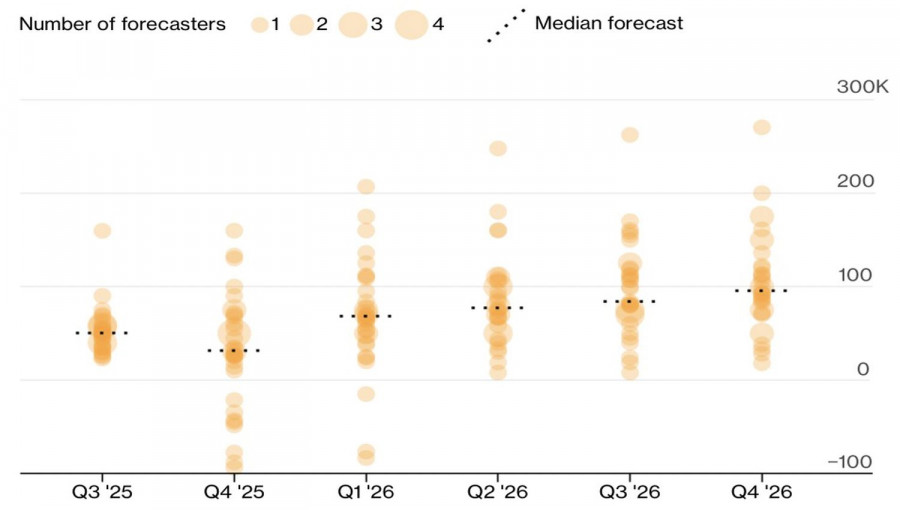 По словам президента ФРБ Ричмонда Томаса Баркина, инфляция и безработица отошли от целевых ориентиров ФРС. Однако существует ограниченный риск, что они продолжат двигаться в тех же направлениях. Подобная риторика предполагает, что у центробанка нет необходимости агрессивно ослаблять денежно-кредитную политику. Нужны точечные меры. Согласны с чиновником FOMC эксперты Bloomberg. Их консенсус-прогноз предполагает, что занятость вне сельскохозяйственного сектора США в четвертом квартале будет расти в среднем на 71 тыс. за месяц. Это ниже ожидаемых в августе 91 тыс. Однако существенно выше среднего показателя за лето в 29 тыс. Специалисты считают, что такая динамика non-farm payrolls позволит ФРС снизить ставку по федеральным фондам на 100 б.п. к сентябрю 2026. Прогнозы по занятости в США Окончательные масштабы монетарной экспансии будут зависеть от способности Дональда Трампа получить большинство в FOMC. Его человек Стивен Миран в сентябре проголосовал за резку стоимости заимствований на 50 б.п., а в прогнозах показал -125 б.п. до конца 2025. Если президенту удастся наводнить состав Комитета такими людьми, ставка по федеральным фондам упадет существенно. Первый шаг – он трудный самый. Для начала хозяину Белого дома нужно уволить Лизу Кук. Ее дело рассматривается Верховным судом, и адвокаты чиновника FOMC настаивают, что действия Дональда Трампа несут угрозу независимости ФРС. На протяжении девяти десятков лет центробанк проводил самостоятельную денежно-кредитную политику. Но нынешнего хозяина Белого дома это не устраивает.