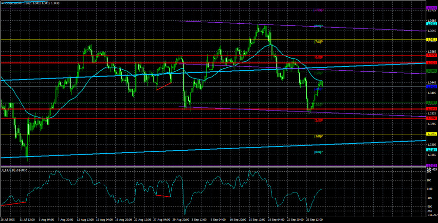 Валютная пара GBP/USD в течение понедельника также склонялась к восходящему движению. Прежде, чем начнем говорить о многострадальном в 2025 году долларе, хотим напомнить, что алогичные движения на рынке возможны и случаются нередко. Напомним, что участники рынка(маркет-мейкеры) торгуют не только с целью получения финансовой выгоды на разнице курсов во времени. Они совершают также сделки необходимые для их деятельности. Поэтому доллар теоретически может дорожать, даже когда все факторы говорят против этого. Зафиксировали. В последние две недели доллар США активно рос. Мы не можем сказать, что это движение было алогичным, но все же определенные основания для укрепления американской валюты имелись. В частности, сильный ВВП или же намеки Эндрю Бейли на еще одно снижение ключевой ставки до конца года. Мы считаем, что большую часть новостей рынок интерпретировал в пользу доллара не вполне логично и справедливо. Однако пара GBP/USD тоже не может двигаться постоянно в одном направлении. Поэтому мы увидели коррекцию, а теперь нужно разобраться с тем, где и когда она будет завершена. Следует признать, Дональд Трамп делает все возможное, чтобы коррекция завершилась как можно скорее. Во-первых, президент США ввел новые пошлины на импорт, которые будут касаться всех грузовиков, мебели и медикаментов иностранного производства. Во-вторых, Дональд Трамп не может договориться с демократами по бюджету на следующий финансовый год, и уже 1 октября Штаты могут погрузиться в очередной для себя «трамповский шатдаун». В-третьих, Дональд Трамп потребовал от Ирана передать весь обогащенный уран, которым располагает страна. Если этого не случится, возможен новый виток геополитического конфликта на Ближнем Востоке. В-четвертых, Трамп оказывает давление на Европейский союз, чтобы тот ввел тарифы и санкции против Индии и Китая в рамках давления на РФ. Как видим, недостатка причин для падения у доллара США нет. Просто следует помнить, что валютный рынок – это Титаник в Атлантическом океане. Чтобы его развернуть, требуется масса усилий и времени. Маркет-мейкеры могут уже сейчас понимать, что доллар продолжит падение, ибо других вариантов нет. Однако свои позиции на продажу доллара они могут готовить и накапливать месяцами. Все это время доллар будет относительно стабилен, а у розничных трейдеров может появиться ложное ощущение завершения «тренда 2025 года». Однако, на наш взгляд, представление только начинается. Трамп понимает, что ему уже 78 лет и президентский срок – не резиновый. Особенно, если он последний. Он спешит, и очень спешит. Именно отсюда вытекают радикальные решения от Белого дома. Поэтому в ближайшие 3-3,5 года нас ждет еще огромное количество событий, которые отложат свой отпечаток на валютном рынке в том числе. А пока мы ждем смены технической тенденции на 4-часовом ТФ, чтобы вновь можно было покупать пару GBP/USD. Отдельно отметим, что индикатор CCI заходил в область перепроданности на восходящем тренде, а цене не удалось преодолеть последний локальный минимум... Средняя волатильность пары GBP/USD за последние 5 торговых дней составляет 89 пунктов. Для пары фунт/доллар это значение является «средним». Во вторник, 30 сентября, таким образом, мы ожидаем движения внутри диапазона, ограниченного уровнями 1,3343 и 1,3521. Старший канал линейной регрессии направлен вверх, 