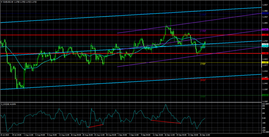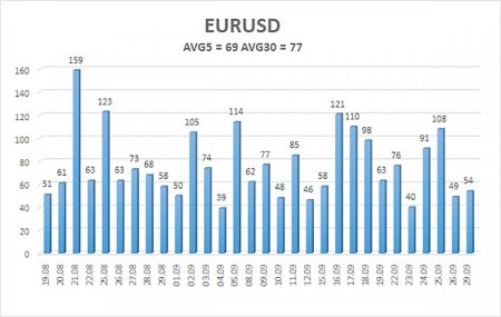 Валютная пара EUR/USD в течение первого торгового дня недели продолжала восходящее движение, которое началось еще в пятницу. Особенно примечательно выглядит рост евро на азиатской и европейской торговых сессиях, когда никаких макроэкономических публикаций не было. Конечно, доллар по его собственным меркам 2025 года снизился незначительно – всего несколько десятков пунктов. Однако, учитывая фундаментальный фон, мы ожидаем, что уже довольно скоро американская валюта полетит в пропасть темпами первой половины текущего года. Как говорится, беда подкралась незаметно. В последние полторы-две недели американская валюта почивала на лаврах. Фондовый рынок растет, экономика США растет, Дональд Трамп не вводил новых тарифов месяца полтора, а борьба с ФРС проиграна президентом США вчистую. Казалось бы, настал момент, когда доллар развернется и прекратит свое затяжное падение. Однако Дональд Трамп почуял «неладное» и ввел новые отраслевые тарифы на грузовики, медикаменты и даже мебель. Что это? Эскалация торговой войны. А по какой причине падал доллар в первой половине 2025 года? Вопрос риторический... Также следует сказать про очередной «шатдаун». При Трампе «шатдауны» стали уже просто какой-то обыденностью. Каждый год с наступлением нового финансового года демократы и республиканцы не могут договориться о бюджете. При чем, договориться они не могут, только когда Трамп президент. Напомним, что во времена первой каденции Трампа зафиксирован самый длительный шатдаун в истории США – 35 дней. Конечно, шатдаун не означает, что всех государственных сотрудников уволят, а все государственные структуры не будут работать. Или означает? Дональд Трамп распорядился, чтобы соответствующие ведомства готовились к массовым увольнениям. Что это? Новый метод противостояния демократам? Ведь все прекрасно понимают, что за массовыми увольнениями сотрудников последует тотальная критика Демократической партии, «которая не оставила Трампу иного выбора». Судьба людей, как это уже привычно в США, никого не интересует. Напомним, что «Один большой прекрасный и удивительный закон» Трампа, который был принят пару месяцев назад, предполагает не только снижение налогов, но и резкое сокращение медицинских и социальных программ. На сейчас раз камень преткновения тоже в этих программах. Демократы хотят сохранить хотя бы какую-то помощь социально малозащищенным слоям населения, Трамп и его команда настаивают на обратном. Если до 1 октября правящие элиты не договорятся, Америка погрузится в очередное проявление «Великого будущего». Честно говоря, даже сложно предположить, при каких обстоятельствах в ближайшее время рынок будет покупать доллар. Конечно, отчет NonFarm Payrolls может оказаться выше прогнозов, потому что теперь сами прогнозы, что называется, ниже плинтуса. Ранее Бюро статистики прогнозировало от 100 до 200 новых рабочих мест, а теперь 39. Превысить цифру 39 гораздо проще, чем цифру 100 тысяч. Таким образом, мы даже не удивимся новому росту доллара. Однако оснований для этого по-прежнему нет. Остается лишь дождаться закрепления цены выше мувинга, чтобы техническая и фундаментальная картины указывали в одном направлении. Средняя волатильность валютной пары EUR/USD за последние 5 торговых дней по состоянию на 30 сентября составляет 69 пунктов и характеризуется, как «средняя