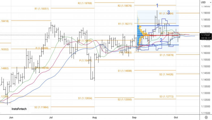 Если прибавить к этому 30-й рекордный максимум S&P 500 и связанный с ним рост глобального аппетита к риску, непонятно, откуда берутся силы у «медведей» по EURUSD. Они упорно сопротивляются своим противниками и не намерены выбрасывать белое полотенце на ринг даже в таких неблагоприятных для себя условиях. Если рынок не идет туда, где его ждут, шансы похода в противоположном направлении резко возрастают. Коррекция S&P 500 или приятный сюрприз от американской занятости от BLS станут катализаторами атаки «медведей» по EURUSD. Впрочем, пока основная валютная пара мирно дремлет, противников лучше не будить. Инвесторы как будто перешли в режим ожидания. Данные американскому рынку труда за сентябрь, протоколы последних заседаний ФРС и ЕЦБ, а также выступление Джерома Пауэлла станут определяющими факторами для основной валютной пары. Технически на дневном графике EUR/USD продолжается консолидация. Если по итогам недели будет сформирован внутренний бар, можно размещать ордера на покупку от 1,1745 и на продажу от 1,1710. Для восстановления восходящего тренда или коррекции требуется выход котировок основной валютной пары из торгового диапазона 1,1680-1,1760. Материал предоставлен компанией InstaForex - www.instaforex.com