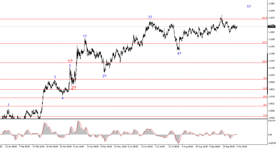 Курс инструмента EUR/USD в течение текущей недели прибавил около 40 базовых пунктов, но амплитуда движения была крайне низкая, а цена преимущественно двигалась горизонтально. Несколько интересных моментов. Практически каждый день новостной фон был либо сильным, либо интересным, но как раз в такие дни амплитуда движений и активность рынка была минимальной. А, например, в четверг, когда и новостей-то не было почти никаких, спрос на валюту США резко вырос. Рынок увеличил спрос на доллар, несмотря на «шатдаун», новый удручающий отчет по рынку труда США. И даже в пятницу, когда американская валюта снизилась, движение вверх могло быть гораздо более сильным, исходя только из отчета ISM по деловой активности в сфере услуг США. Напомню, что в последние месяцы и даже годы именно индекс сферы услуг держался на плаву увереннее всего. Однако по итогам сентября индекс деловой активности опустился до отметки 50,0. Это еще не кризис, но это уже пограничное значение. На 0,1 пункта ниже – и можно будет говорить о падении деловой активности во всех сферах США. Напомню, что ранее на неделе вышел ISM для сферы производства, который также ничем не порадовал рынки. Исходя из всего вышесказанного, если бы инструмент начал расти в понедельник на ожиданиях начала «шатдауна» и закончил расти в пятницу на фоне слабой статистики США и начавшегося «шатдауна», это было бы наиболее закономерным сценарием. Тем более, что волновая разметка раньше предполагала повышение, и сейчас тоже предполагает повышение котировок. Однако что-то пошло не по плану.Общие выводы.