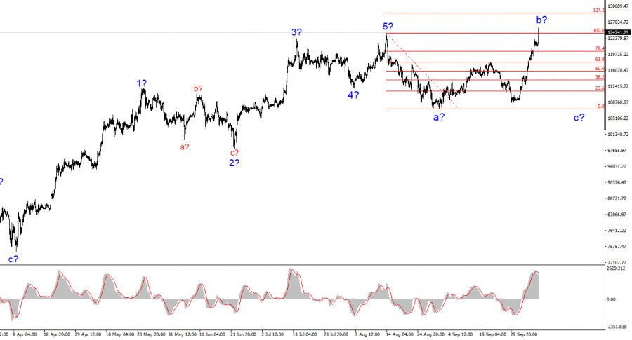 Курс биткоина с 28 сентября вырос уже на 16000$. Американское правительство и большая часть государственных учреждений ушли в отпуск из-за отсутствия финансирования, что повысило спрос на рисковые активы. В данное время вряд ли кто-либо из инвесторов желает покупать государственные облигации США, поэтому начался переток капитала в другие инструменты инвестирования. Однако рост цифрового золота идет в разрез с текущей волновой разметкой. В последние месяцы она не вызывала никаких сомнений и опасений, но новостной фон оказывает неблагоприятное влияние волновую структуру. На текущий момент еще нельзя считать, что сценарий с построением понижательного участка тренда отменен, но он находится на грани отмены. Сегодня ночью котировки BTC пробили пик предполагаемой волны 5 последнего повышательного участка тренда. Из этого следует, что мы можем увидеть либо сложную, горизонтальную коррекционную структуру, либо же новый повышательный участок тренда даже без стандартной и классической трехволновой коррекционной структуры. Я уже задавался вопросом о том, не является ли обманом текущий рост биткоина? В данное время рынок показывает, что повышательный тренд сохраняется, как бы подталкивая участников рынка к новым покупкам по историческим ценам. Что если это ловушка? На мой взгляд, биткоин может продолжить повышение, что никак не вяжется с текущей волновой разметкой и другими видами анализа. Запретить покупать я никому не могу, но лично для меня покупка актива по исторически максимальным ценам – не лучшая идея. Я считаю, что существует опасность такого же обвала, как 14 июля или 14 августа. Рассматривать покупки я начну лишь когда увижу четкую трехволновую коррекционную структуру.