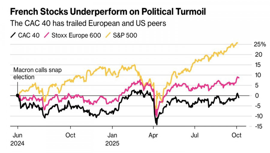 Динамика дифференциала доходности облигаций Германии и ФранцииРаспродажи французских ценных бумаг взвинтили спред доходности местных и немецких облигаций, ключевой показатель европейского политического риска, к максимальным отметкам с конца 2024. Инвесторы всерьез обеспокоены, что смена одного на другого премьер-министра, каждый из которых не способен управлять, в конечном итоге вынудит Эммануэля Макрона уйти с поста президента страны. Такой сценарий развития событий оказался бы губительным для EUR/USD.У нынешнего главы государства все те же варианты, что и ранее: от назначения нового главы правительства до внеочередных выборов в парламент и собственной отставки. Каждый из них имеет свои минусы. Почувствовавшие кровь правые и левые партии теперь будут иметь гораздо больше причин не согласиться с бюджетом, кем бы ни был новый глава правительства. Причем до принятия нового финансового плана остается все меньше времени, возрастает риск чрезвычайных мер. Распродаются не только французские облигации, но и акции. CAC-40 в 2025 плетется в числе отстающих на европейском рынке долевых бумаг. Он проигрывает EuroStoxx 600. Не говоря уже об уверенно себя чувствующем в последнее время S&P 500. Преимущество индексов Нового Света над аналогами из Старого приводит к переливу капитала и ставит палки в колеса «быков» по EUR/USD на пути восстановления восходящего тренда. Динамика фондовых индексов США и ЕвропыЭскалация политического кризиса во Франции, сомнения в эффективности фискальных стимулов Фридриха Мерца в Германии, проигранная Европой торговая война и сохранение геополитической напряженности из-за событий на Украине заставляют сомневаться, что евро сможет вырасти к 1,2 в 2025. Несмотря на дивергенцию в монетарной политике. Действительно, авторитетные чиновники Управляющего совета главный экономист Филип Лейн и вице-президент Луис де Гиндос дали понять, что цикл монетарной экспансии ЕЦБ подошел к концу. По их мнению, риски движения инфляции в том или ином направлении сбалансированы. Можно дать определенные гарантии, что потребительские цены стали на якорь вблизи 2%. ФРС же намерена продолжать снижать ставки, что негативно отразится на долларе США. Технически на дневном графике EUR/USD имеет место коррекция в рамках реализации разворотного. Паттерна 1-2-3. Сформированные на прорыве нижней границы консолидации вблизи 1,171 шорты следует удерживать. Материал предоставлен компанией InstaForex - www.instaforex.com