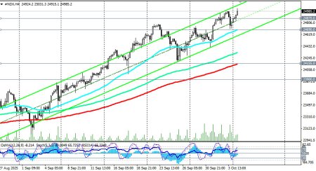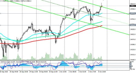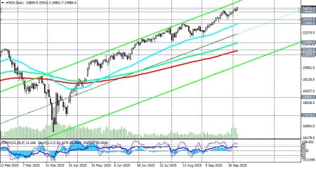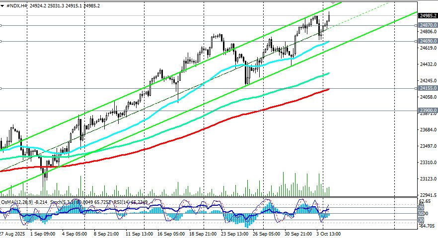Фьючерсы NASDAQ100 (в торговом терминале отражаются как NDX) торгуются в зоне бычьего рынка, выше ключевых уровней поддержки 22100.0 (ЕМА200 на дневном графике), 17670.0 (ЕМА200 на недельном графике), 11700.00 0 (ЕМА200 на месячном графике NDX). Любые коррекции к значимым уровням поддержки следует использовать как возможность нарастить длинные позиции, а также открыть новые. Предпочтительными, учитывая также ожидания дальнейших снижений процентной ставки ФРС, остаются длинные позиции, отметили мы в нашем сегодняшнем фундаментальном анализе и обзоре «NDX (NASDAQ100): инвесторы сохраняют оптимизм». Первым сигналом для новых длинных позиций может стать пробой максимума предыдущей недели и отметки 24981.0, а затем – максимума сегодняшнего торгового дня 25031.0. В основном сценарии, таким образом, ожидаем продолжение роста цены. В альтернативном сценарии цена пробьёт краткосрочный уровень поддержки 24870.0 (ЕМА200 на 15-минутном графике) и снизится к уровню поддержки 24690.0 (ЕМА200 на 1-часовом графике). Более глубокая коррекция подразумевает снижение к уровням поддержки 24155.0 (ЕМА200 на 4-часовом графике) и к 23900.0 (ЕМА50 на дневном графике), от которых, учитывая устойчивый восходящий тренд, можно строить новые длинные позиции. Более глубокую коррекцию не рассматриваем. В целом преобладает восходящая динамика, что делает предпочтительными длинные позиции. открыть торговый счет + зарегистрироваться в системе копирования сигналов + инвестировать в ПАММ-системеМатериал предоставлен компанией InstaForex - www.instaforex.com
