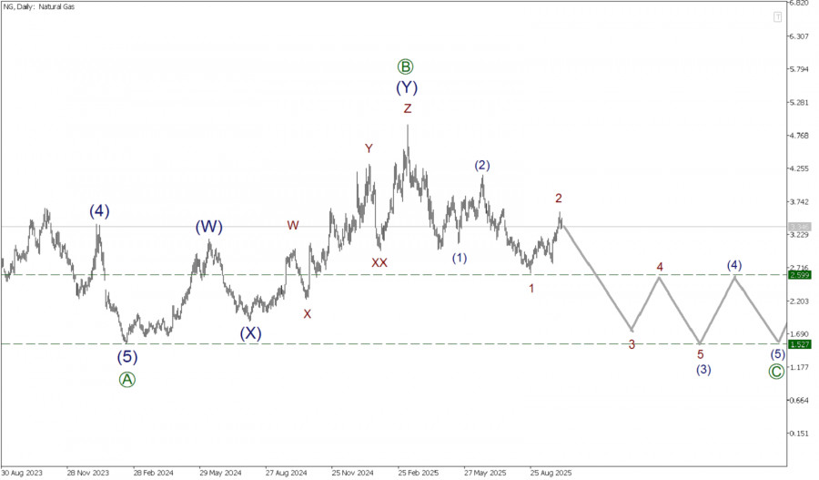 Глядя на текущий график, можно заметить, что по газу может формироваться крупный коррекционный тренд. На текущем графике представлена разметка большой действующей волны (Y), принимающей форму тройного зигзага W-X-Y-XX-Z. На текущем графике мы видим, что действующая волна Z похожа на стандартный зигзаг, внутри которого завершен импульс [A]. Сейчас может формироваться коррекционная подволна [B], которая, судя по всему, принимает форму двойного зигзага (W)-(X)-(Y). Предполагается, что на сегодняшний день завершена только первая действующая волан (W), она приняла форму двойного зигзага W-X-Y. Сейчас в процессе развития может находиться противодействующая волна связка (X), она тоже представляет собой двойной зигзаг W-X-Y. На последнем участке графика может формироваться финальная зигзагообразная волна Y. Внутри волны Y могла подойти к концу коррекционная подволна [B], поэтому в ближайшее время участников рынка может ждать разворот цены и начало падения в импульсе [C]. Вполне возможно, что быки поведут рынок за собой в сторону уровня 1.52. На указанной отметке ранее была завершена подволна [A]. В текущей ситуации можно рассматривать открытие коротких позиций. Торговые рекомендации: Sell 3.34, takeprofit 2.59.