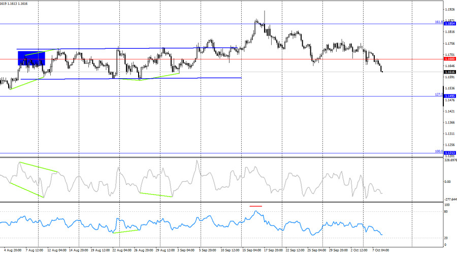Ситуация с волнами на часовом графике остается простой и понятной. Последняя завершенная волна вверх не пробила пик предыдущей волны, а новая волна вниз пробила предыдущий лоу. Таким образом, в данное время тренд остается «медвежьим». Последние данные по рынку труда и изменившиеся перспективы ДКП ФРС поддерживают трейдеров-быков, поэтому я ожидаю смену тренда на «бычий». Для того, чтобы «медвежий» тренд завершился, требуется закрепление цены выше последнего пика – 1,1779. Во вторник информационный фон вновь практически отсутствовал. Новое выступление Кристин Лагард не дало никакой новой пищи для размышлений, так как президент ЕЦБ больше говорила о замороженных активах и кредитах Украине. В это же время «шатдаун» в Америке продолжается. Демократы и республиканцы предприняли новую попытку не договориться, а принять проект бюджета через голосование в Сенате. Попытка завершилась неудачно также, как и все предыдущие попытки. Я не понимаю, в чем смысл таких голосований, если стороны не готовы идти на компромисс. Однако сам доллар, который должен был оказаться под давлением рынка из-за «шатдауна», чувствует себя просто прекрасно и не испытывает никаких проблем. Впервые за долгое время при негативном информационном фоне американская валюта растет. Графическая картина продолжает свидетельствовать о «медвежьем» тренде, поэтому нужно хотя бы дождаться его завершения, чтобы иметь возможность отрабатывать информационный фон.