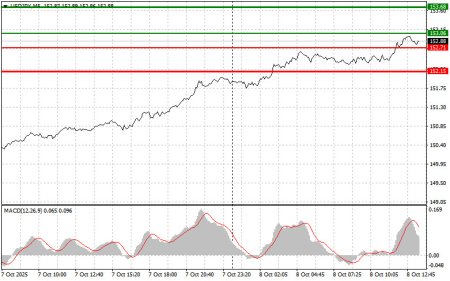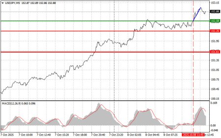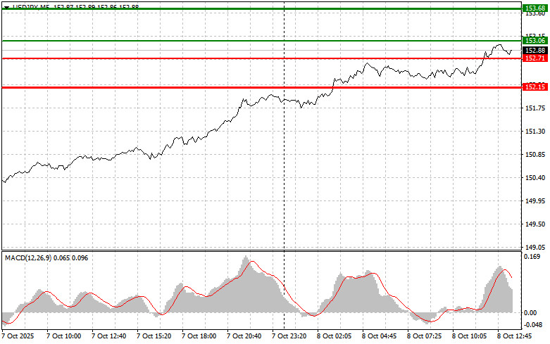 Разбор сделок и советы по торговле японской иенойТест цены 152.58 в первой половине пришелся на момент, когда MACD только начинал движение вверх от нулевой отметки, что стало подтверждением правильной точки входа на покупку доллара в продолжение развития бычьего рынка. В результате пара выросла на 35 пунктов. Рынок готовится к важным интервью. Особое внимание трейдеры уделят заявлениям членов FOMC, в частности, Майкла С. Барра и Нила Кашкари. Не менее важным событием станет публикация протокола сентябрьской встречи ФРС, где впервые за текущий год было принято решение о смягчении процентной ставки. В самом протоколе, вероятно, будут изложены причины, подтолкнувшие регулятор к этому решению, а также обозначены дальнейшие перспективы.Заявления Барра и Кашкари также будут представлять особый интерес. В текущей обстановке регуляторам крайне важно соблюдать баланс между поддержкой рынка труда и инфляцией. Их замечания дадут возможность оценить готовность ФРС к дальнейшему ослаблению монетарной политики. Если голубиного тона мы не услышим, доллар может продолжить рост против иены по аналогии со вчерашним днем. Что касается внутридневной стратегии, то больше буду опираться на реализацию сценариев №1 и №2.Сигнал на покупкуСценарий №1: покупать USD/JPY сегодня планирую при достижении точки входа в районе 153.06 (зеленая линия на графике) с целью роста к уровню 153.68 (более толстая зеленая линия на графике). В районе 153.68 буду выходить из покупок и открывать продажи в обратную сторону (расчет на движение в 30-35 пунктов в обратную сторону от уровня). Рассчитывать на рост пары можно в продолжение утренней тенденции. Важно! Перед покупкой, убедитесь в том, что индикатор MACD находится выше нулевой отметки и только начинает свой рост от нее.Сценарий №2: покупать USD/JPY сегодня также планирую в случае двух подряд тестов цены 152.71 в момент, когда индикатор MACD будет находиться в области перепроданности. Это ограничит нисходящий потенциал пары и приведет к обратному развороту рынка вверх. Можно ожидать рост к противоположным уровням 153.06 и 153.68.Сигнал на продажу Сценарий №1: продавать USD/JPY сегодня планирую после обновления уровня 152.71 (красная линия на графике), что приведет к быстрому снижению пары. Ключевой целью продавцов будет уровень 152.15, где буду выходить из продаж, а также открывать сразу покупки в обратную сторону (расчет на движение в 20-25 пунктов в обратную сторону от уровня). Давление на пару может вернуться при голубиной позиции представителей ФРС. Важно! Перед продажей, убедитесь в том, что индикатор MACD находится ниже нулевой отметки и только начинает свое снижение от нее. Сценарий №2: продавать USD/JPY сегодня также планирую в случае двух подряд тестов цены 153.06 в момент, когда индикатор MACD будет находиться в области перекупленности. Это ограничит восходящий потенциал пары и приведет к обратному развороту рынка вниз. Можно ожидать снижения к противоположному уровню 152.71 и 152.15.Что на графике:Тонкая зеленая линия – цена входа, по которой можно покупать торговый инструмент;