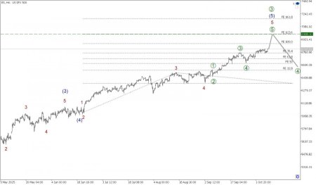 FxSignal 8-10-2025, 21:39 28 Аналитика, прогнозы валютного рынкаВ глобальной перспективе по индексу SP500 может формироваться крупный импульс (1)-(2)-(3)-(4)-(5). Подволна (1) и (2) сформированы. На последнем участке графика представлена восходящая импульсная волна (3), размеченная подволнами 1-2-3-4-5. В составе волны (3) завершенными смотрятся подволны 1-2-3-4. Коррекционная волна 4 не так давно подошла к концу и приняла форму двойного зигзага. На последнем участке цены мы можем наблюдать построение новой и финальной волны 5. Волна 5 может принять форму импульса [1]-[2]-[3]-[4]-[5]. Завершены подволны [1]-[2], и сейчас растем в более мощной подволне [3]. Вероятно, быки нацелены на предыдущий максимум 6864, на указанном уровне величина импульса 5 будет равна 100% по расширению Фибоначчи от волны 3. В текущей ситуации можно рассматривать открытие длинных позиций с целью забрать прибыль на завершении импульсного роста в районе предыдущего максимума. Торговые рекомендации: Buy 6797.39, takeprofit 6988.10.