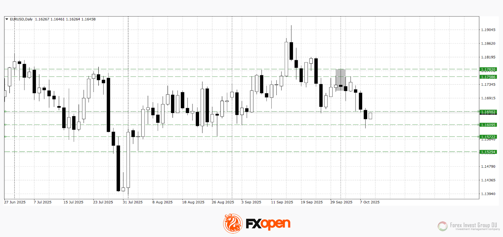 FxSignal 9-10-2025, 15:00 24 Аналитика, прогнозы валютного рынкаЕвро возобновил снижение на фоне политической неопределенности во Франции, тогда как фунт остается под давлением, следуя за общим ослаблением европейских валют. В понедельник евро достиг минимального уровня более чем за неделю после внезапной отставки премьер-министра Франции Себастьена Лекорню, что обострило политический кризис в стране и усилило медвежьи настроения на опционном рынке. Показатель направления опционов, который часто отслеживают участники рынка, перешел из бычьей зоны в отрицательную, сигнализируя о готовности трейдеров к дальнейшим потерям. На фоне снижения активности в США из-за шатдауна внимание участников смещается к европейскому новостному фону. В ближайшие сессии в центре внимания окажутся публикации макроэкономических показателей из еврозоны и Великобритании, которые могут задать краткосрочное направление для EUR/USD и GBP/USD.